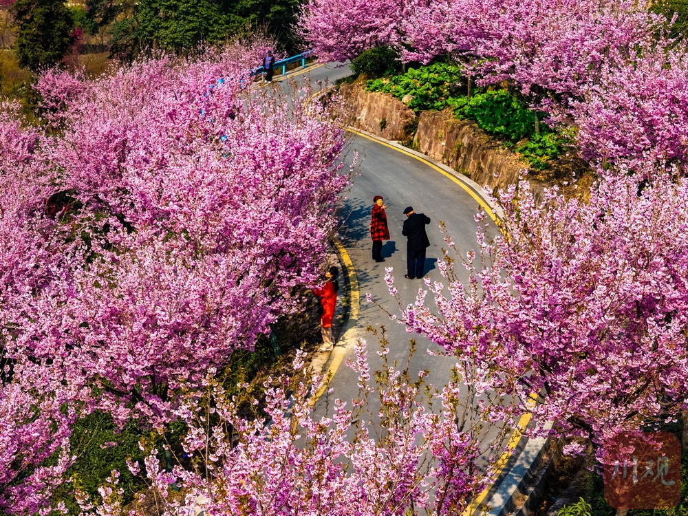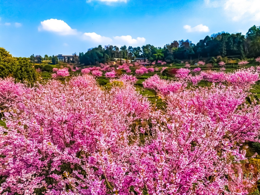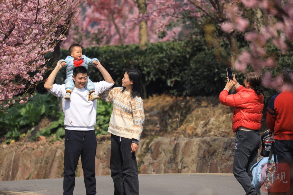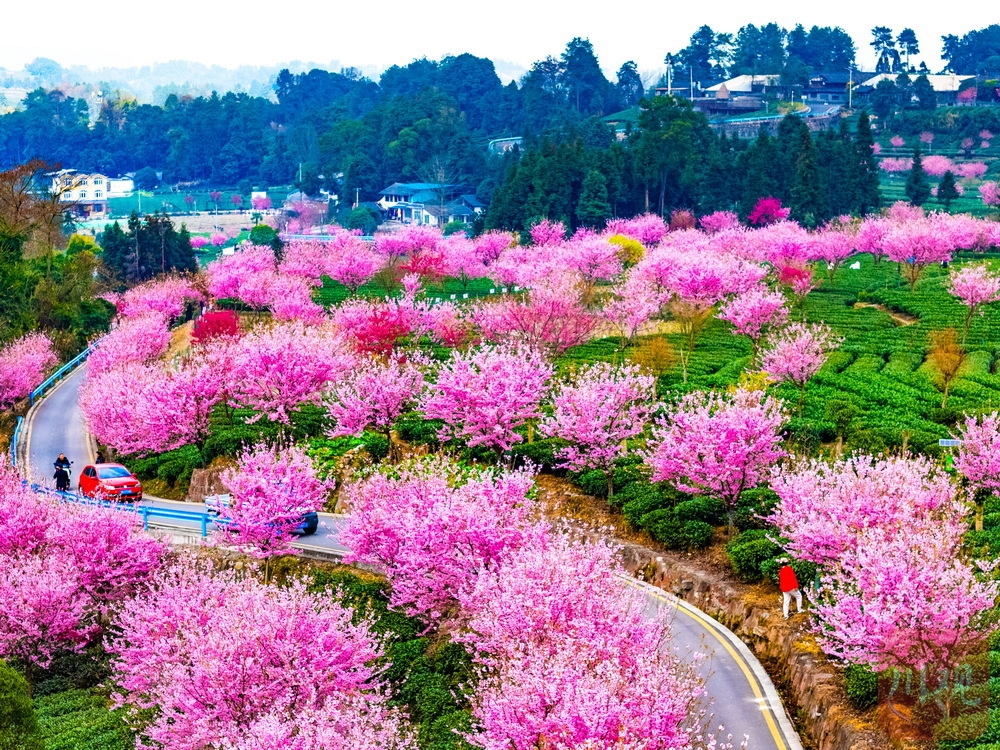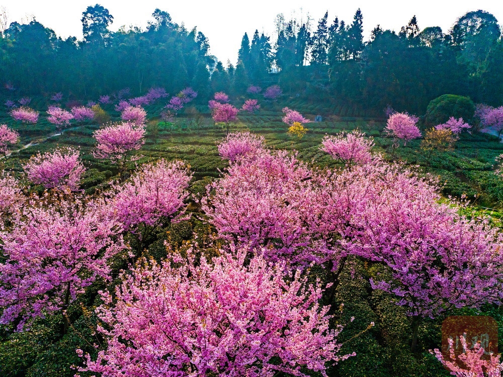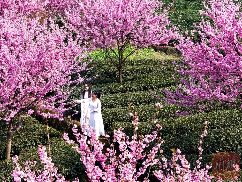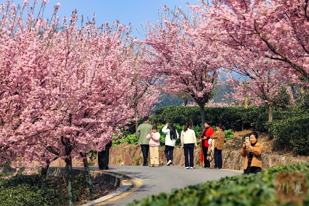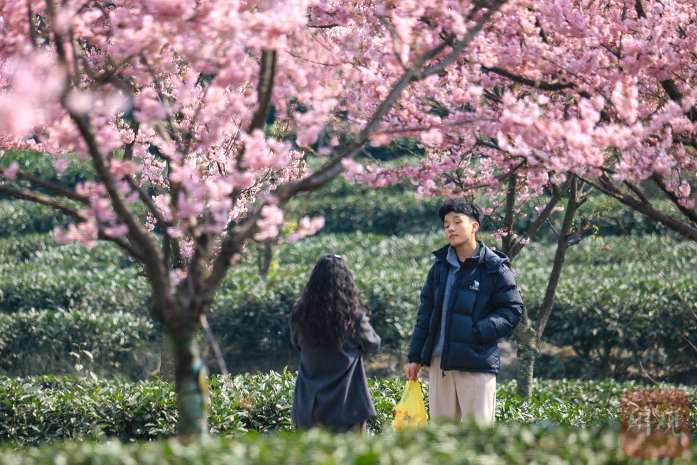 茶山一片葱绿,樱花点缀其中……2月19日,正月初三,走进雅安市名山区新店镇,茶山间的樱花园迎来绚烂花期。翠绿茶山与粉色樱花相互映衬,形成独特景观。吸引了众多游客前来打卡,成为当地新春旅游的一大亮点。