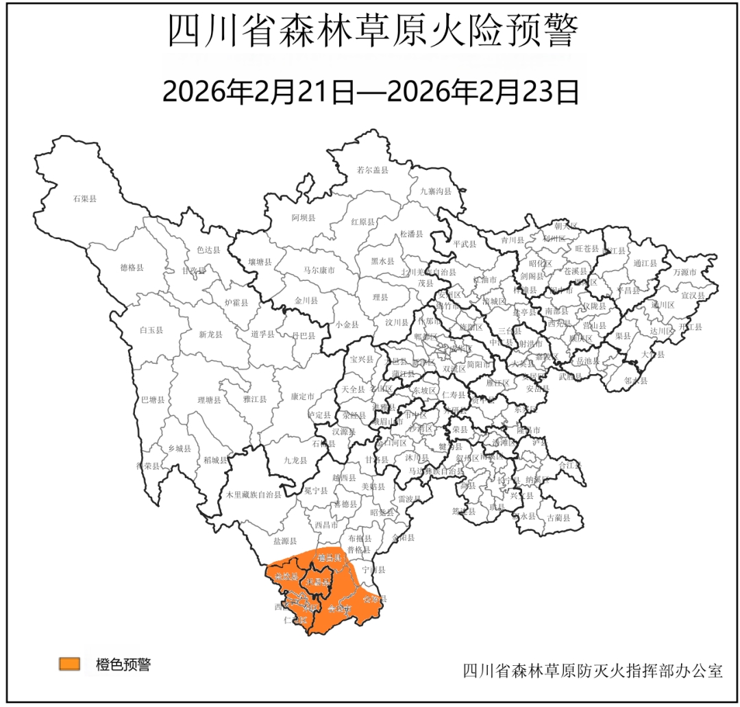 经省森林草原防灭火指挥部办公室与省林草局、四川气象局及相关地方会商研判,结合气象条件、林区物候、人为活动、野外火源及历史火灾发生情况,预计2月21日—23日攀枝花市、凉山州南部(涉及8个县级行政单位,具体范围见下图)森林草原火险等级将维持在高度危险级别,特发布高森林草原火险橙色预警。