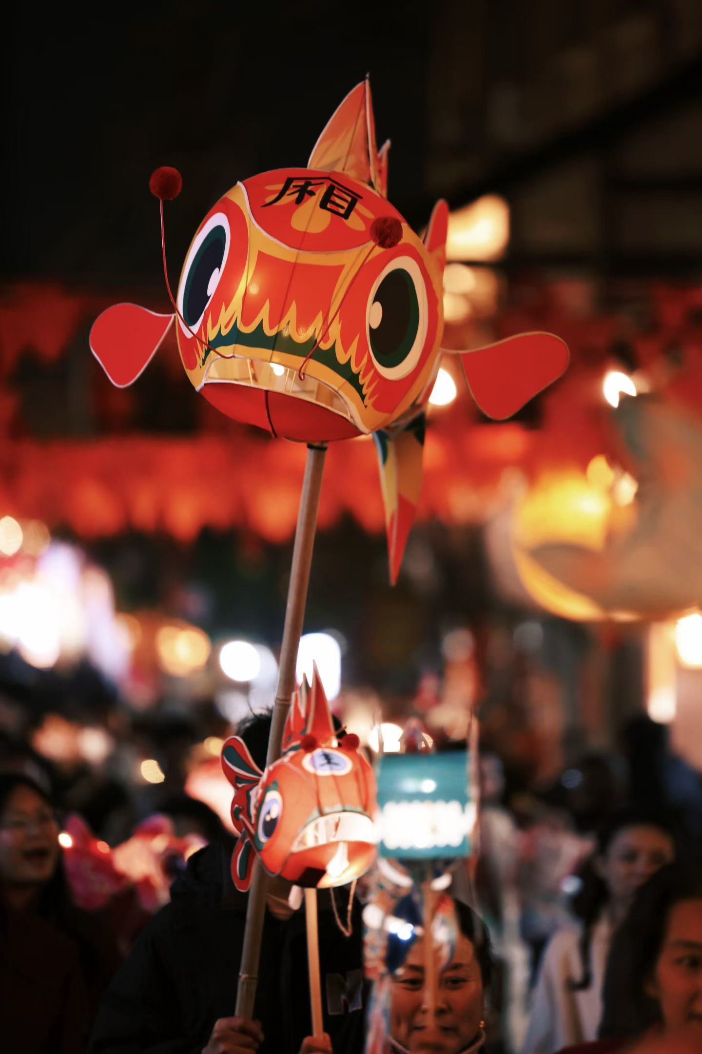 晚上7点,夜幕降临,花灯巡游正式开始。“火树银花不夜天”,城厢古城化身光影秘境,上演一场璀璨的花灯盛宴——鱼灯、龙灯、马灯……各式花灯流光溢彩,形态各异灯光透过灯纸,在青石板路上投下斑驳光影。此时,刘亮和儿子手持自己做的兔灯,跟着队伍到古城多个景点巡游,锣鼓声、欢呼声此起彼伏,市民游客纷纷驻足观赏、拍照打卡,定格这限定的新春年味。