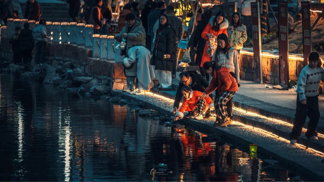 同一时间,在古城西街西牌坊护城河畔,上百名市民游客点亮河灯,放入潺潺流水中。一盏盏河灯带着新春的祝福与期许,顺着河水缓缓流淌,与岸边巡游的花灯交相辉映。