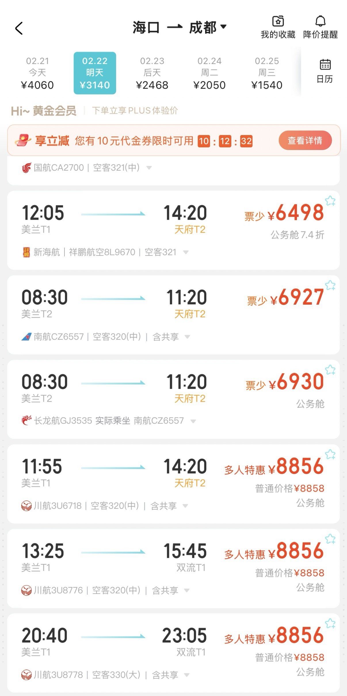 21日13时30分左右,22日海口直飞成都的机票在记者查询的前后10分钟内,2000多元的经济舱已无票,仅剩下部分公务舱机票,价格超4000元,部分上午和中午时段的机票价格超6000元,且处于票源紧张状态;23日海口直飞成都情况类似。截至目前,24日、25日海口直飞成都还有部分经济舱全价机票,26日、27日还有经济舱折扣机票,价格超过1800元。
