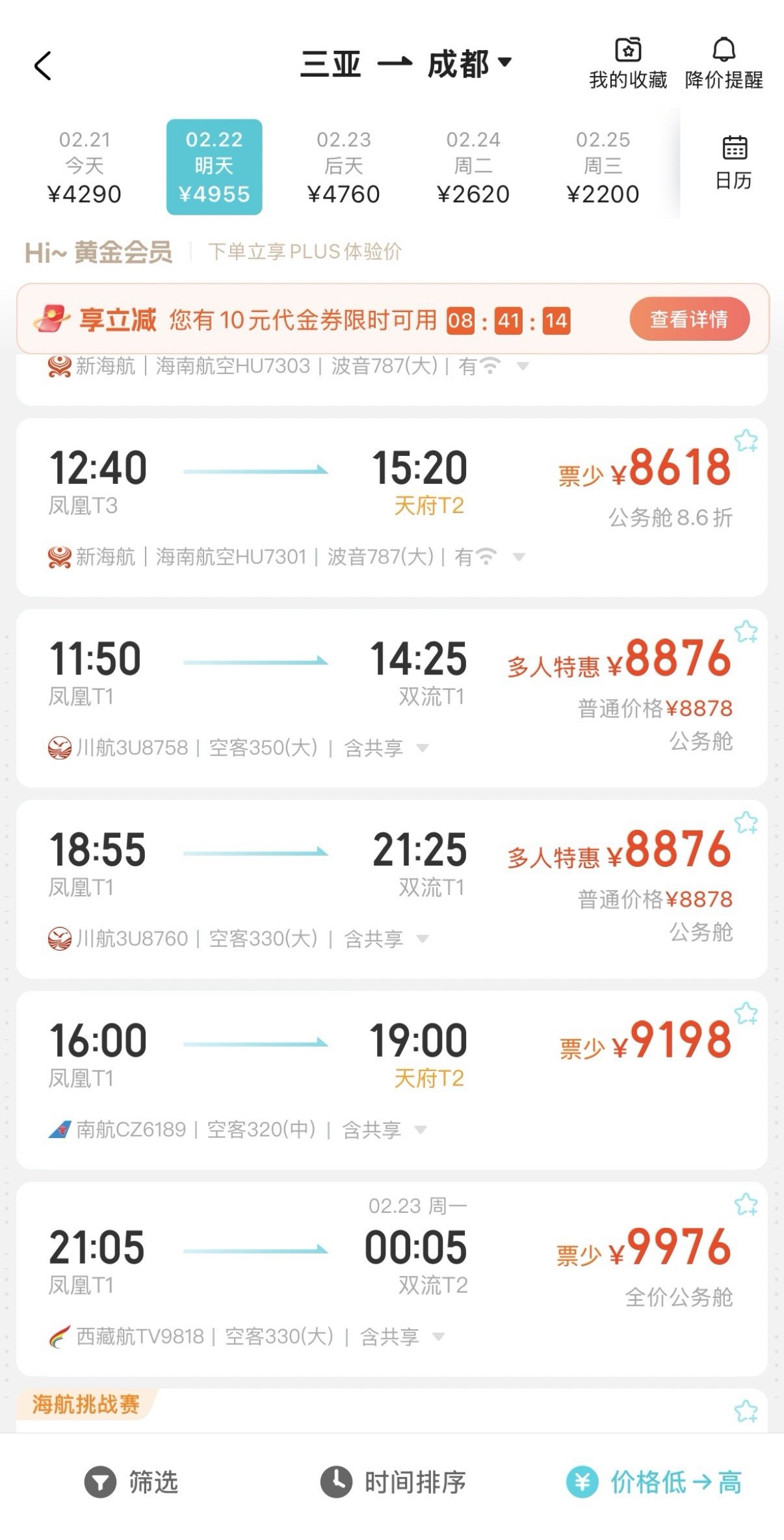 同样的情况,22日、23日、24日三亚直飞成都的机票,经济舱已无票,剩余部分公务舱机票价格超4000元,部分时段机票价近万元。