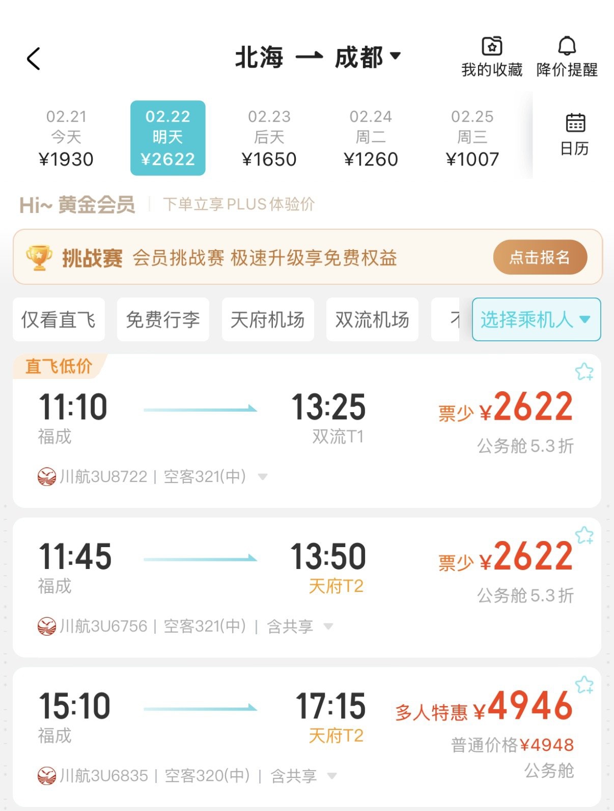 除了海南之外,记者查询发现,22日北海直飞成都已无经济舱机票,仅剩部分公务舱机票,且票源紧张,价格超2600元;23日北海直飞成都机票经济舱价格几乎无折扣,价格超过1600元。24日、25日、26日最低机票价格皆超过1000元。