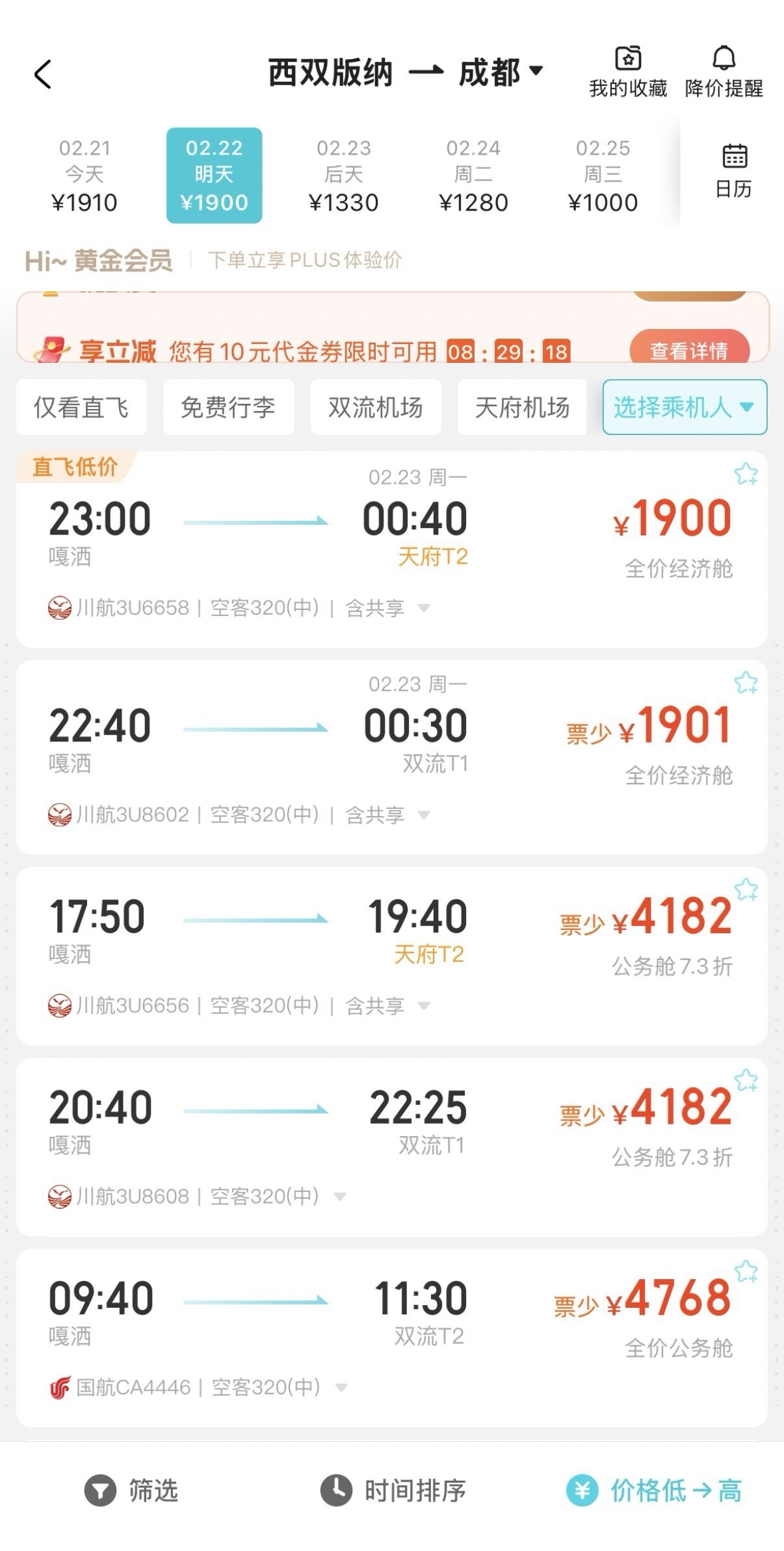 西双版纳、潮州22日直飞成都的返程机票,经济舱价格也是全价无折扣,23日直飞成都的返程机票还有部分折扣机票。