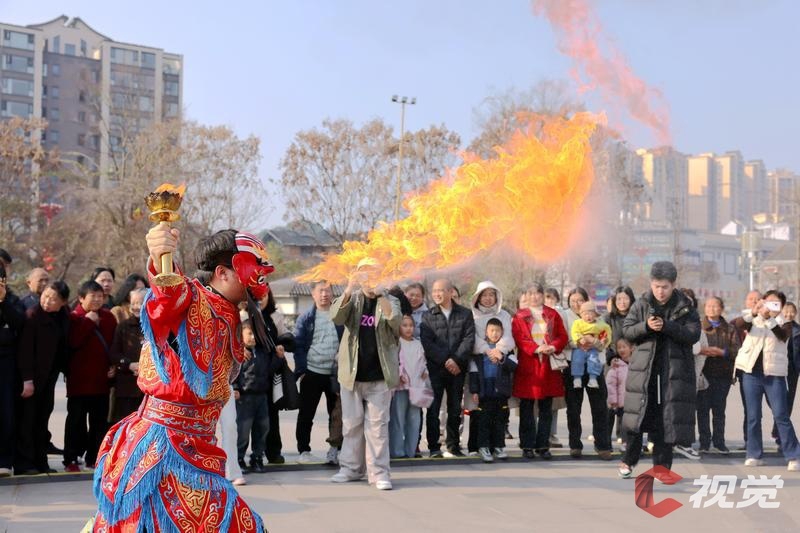 2月21日,在眉山市丹棱县,民间艺人为市民和游客表演吐火。C视觉签约摄影师 姚永亮 摄