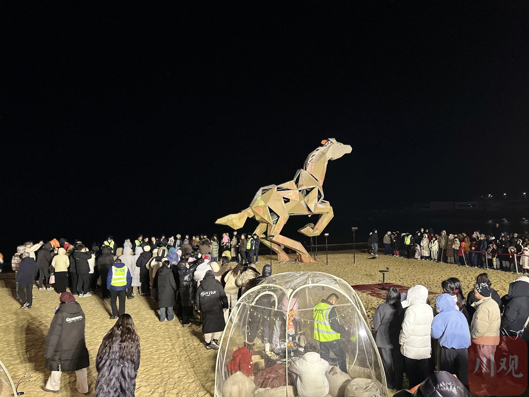傍晚时分,海滩上以马年为主题的“赤骥”造型灯饰成为热门打卡点,吸引众多游客拍照留念。夜光舞狮腾跃献瑞,灵动鱼灯巡游送福,为海滩增添浓浓年味。国家级非物质文化遗产项目“打铁花”漫天绽放,火壶表演气势磅礴,赢得阵阵喝彩。压轴出场的无人机光影秀以“龙凤呈祥”造型点亮夜空,将现场气氛推向高潮。