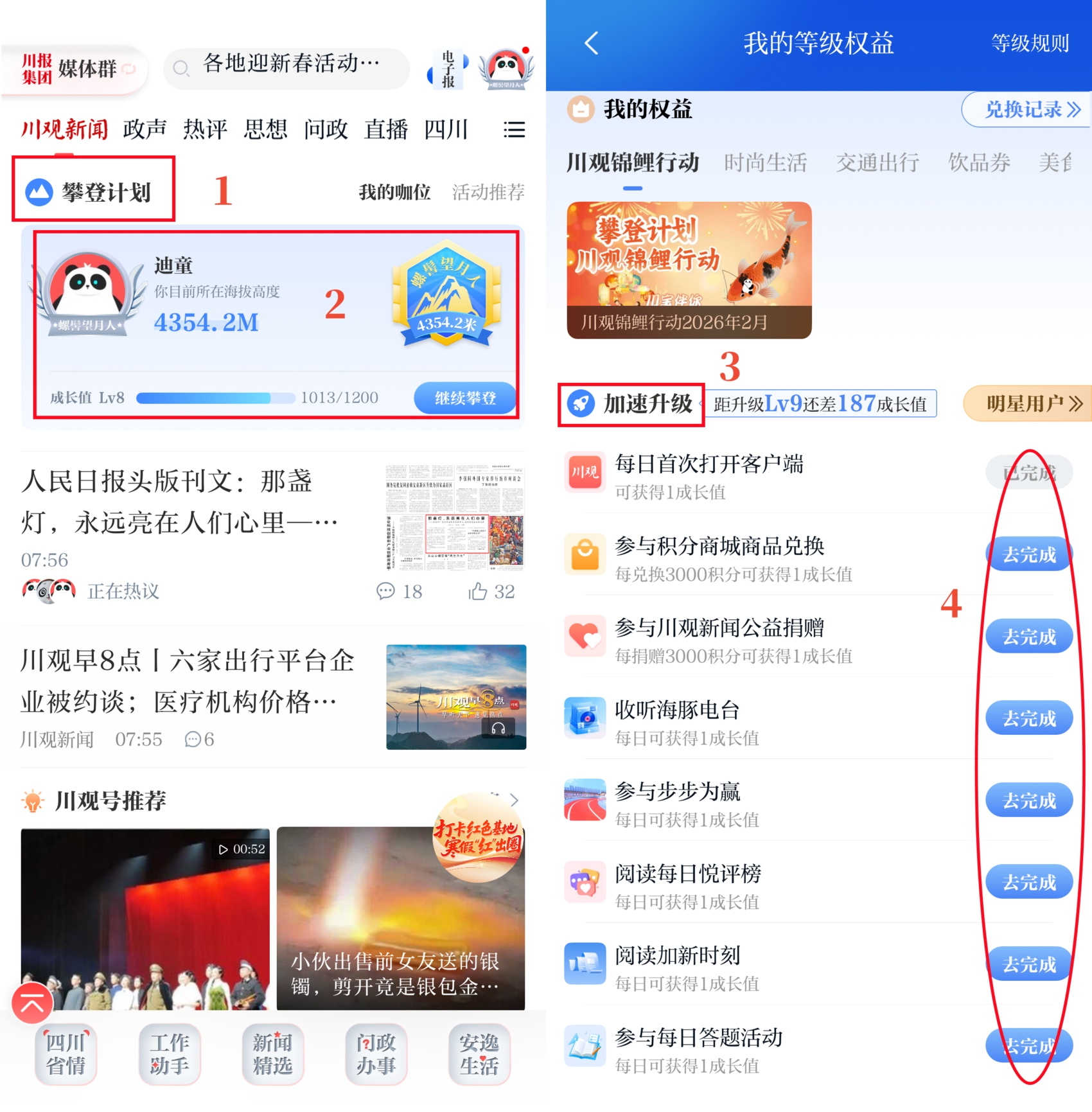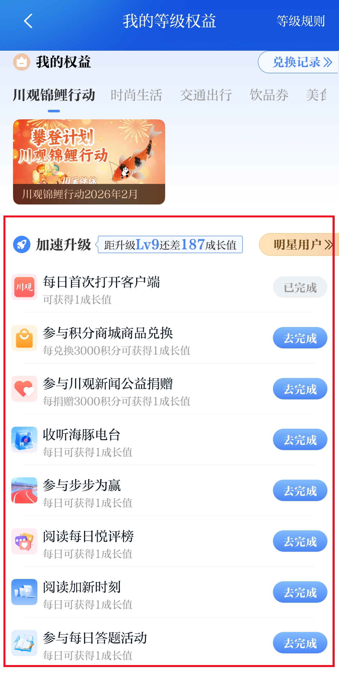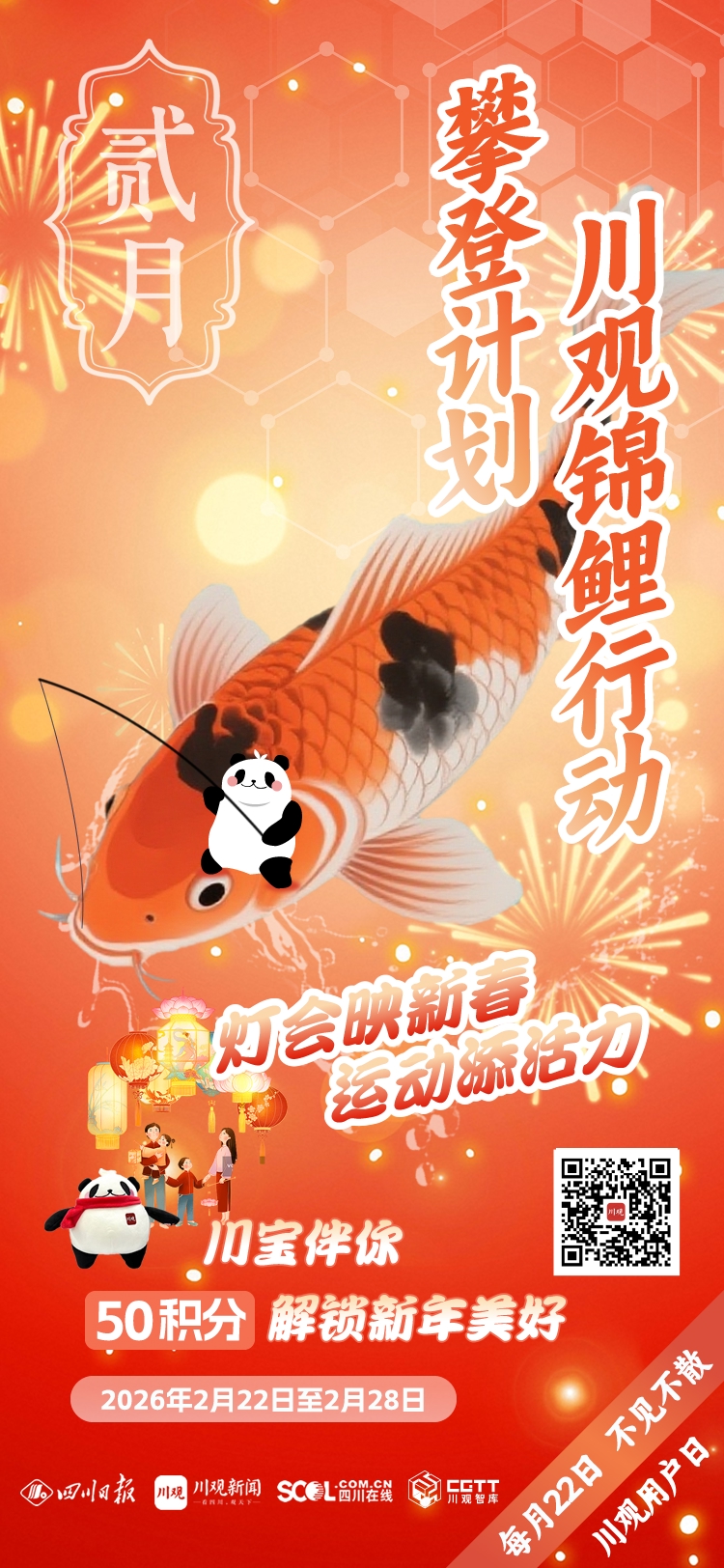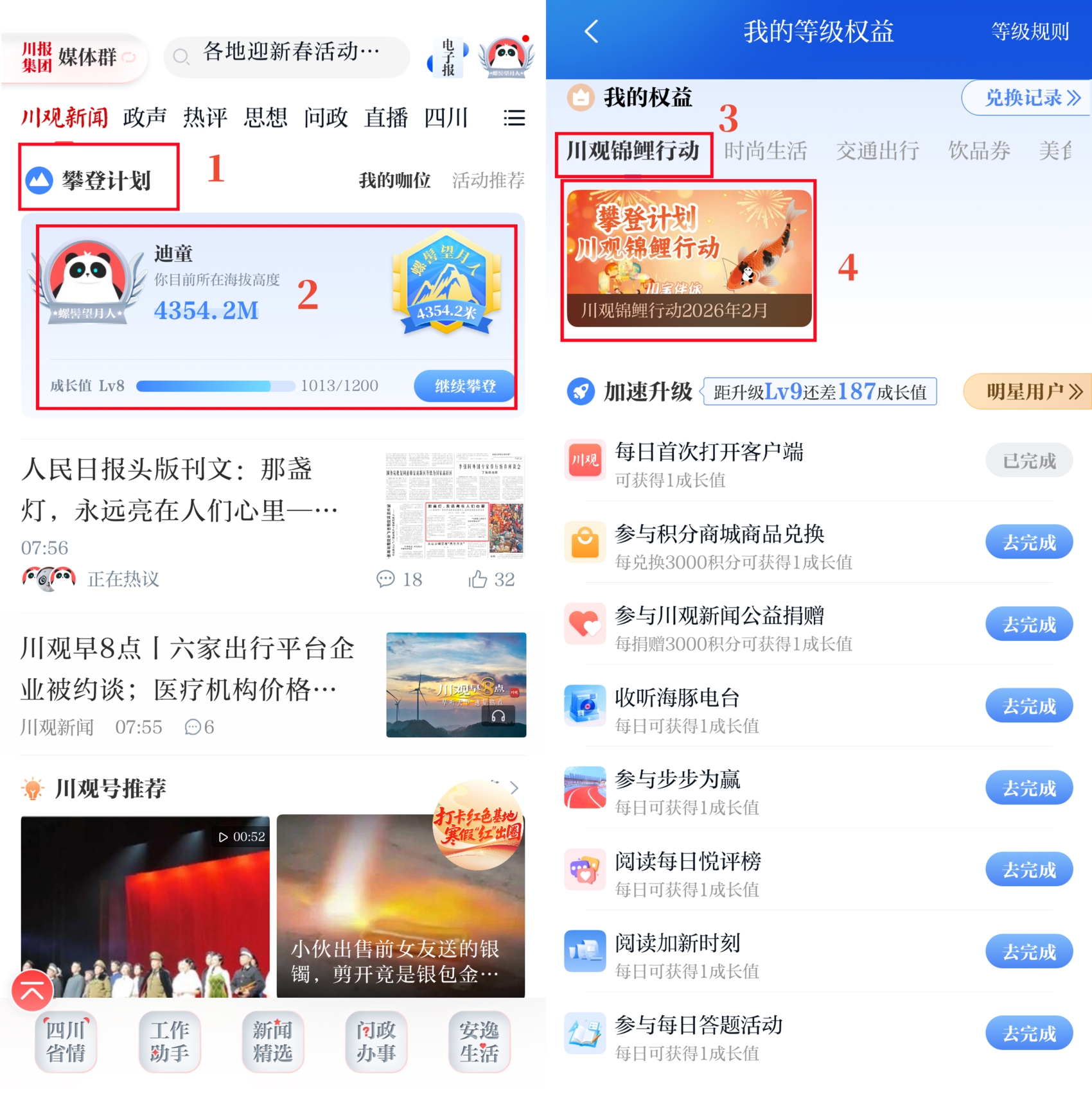 2、在川观新闻首页,点击“攀登计划”—“我的权益”,找到“川观锦鲤行动2026年2月”活动图片,根据提示参与抽奖。