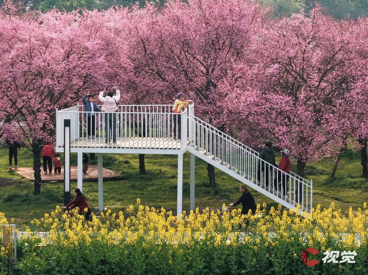2月22日,崇州市戚家湾社区,成片美人梅在初春的暖阳下惊艳绽放,吸引不少市民游客前来游览打卡。C视觉签约摄影师 朱志宏 摄