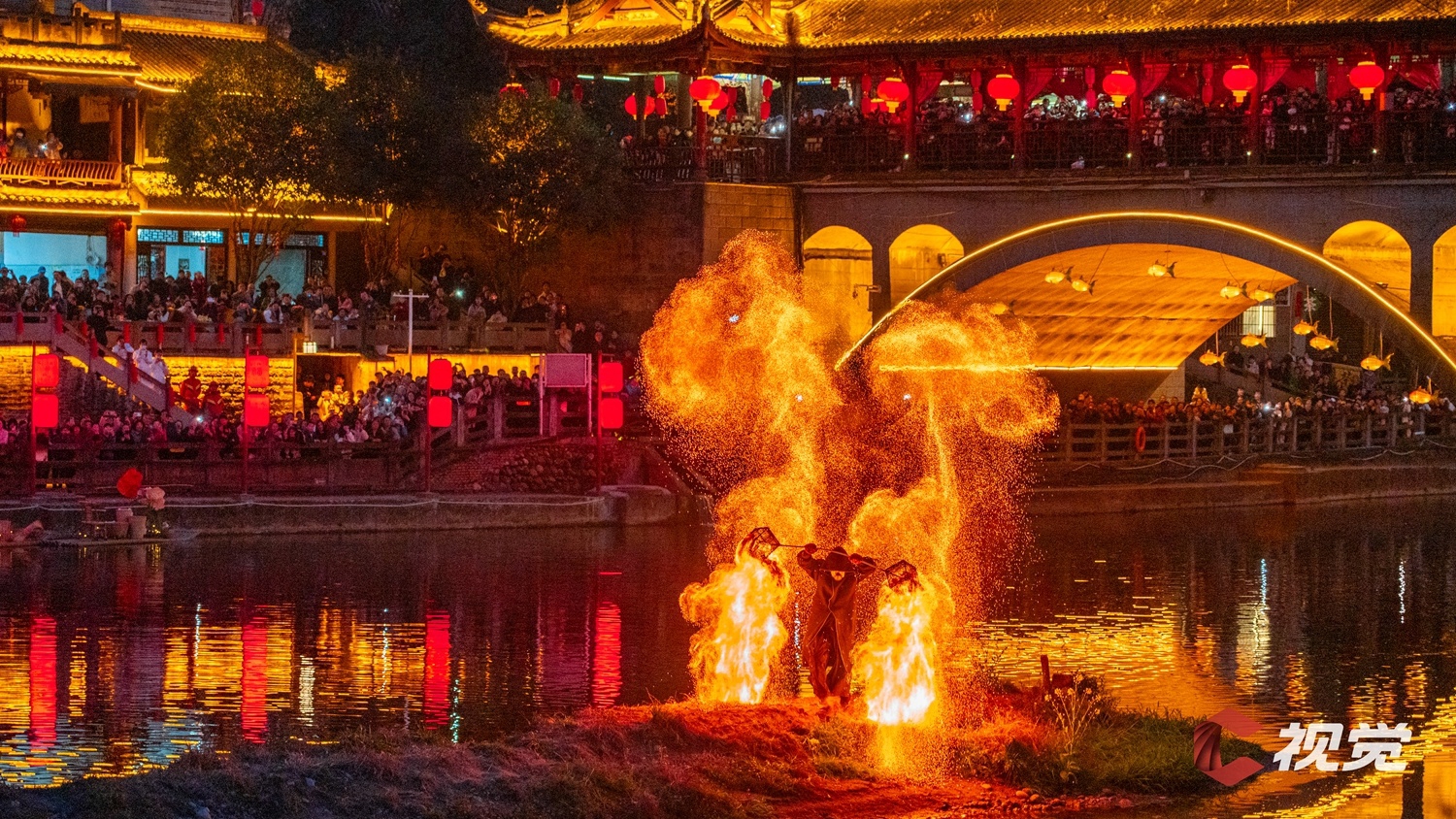 2月21日晚,崇州市街子古镇热闹非凡,景区安排了火壶等非遗表演,让游客在古镇体验热闹年味。C视觉签约摄影师 李旭 摄