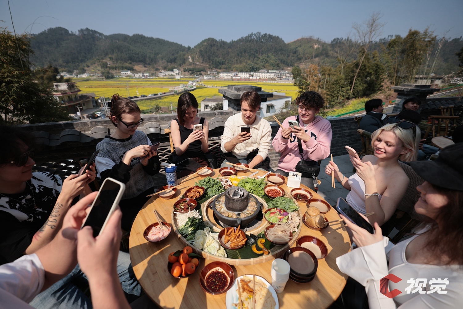 2月21日,宜宾市高县庆岭镇,四川轻化工大学留学生“寻味春晚·高县油菜花海请春酒”团年活动现场,留学生们纷纷拍照打卡省级非遗“川南请春酒”。C视觉签约摄影师 兰锋 摄