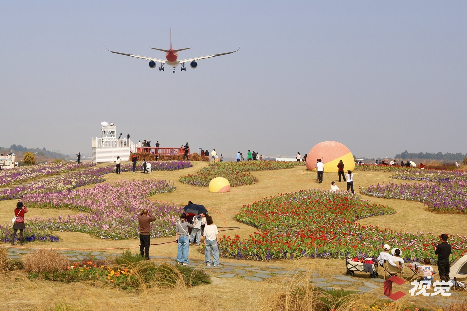 2月21日,成都市天气晴朗,不少市民游客前往双流区空港花田看飞机、赏花、晒太阳。C视觉签约摄影师 邓国平 摄