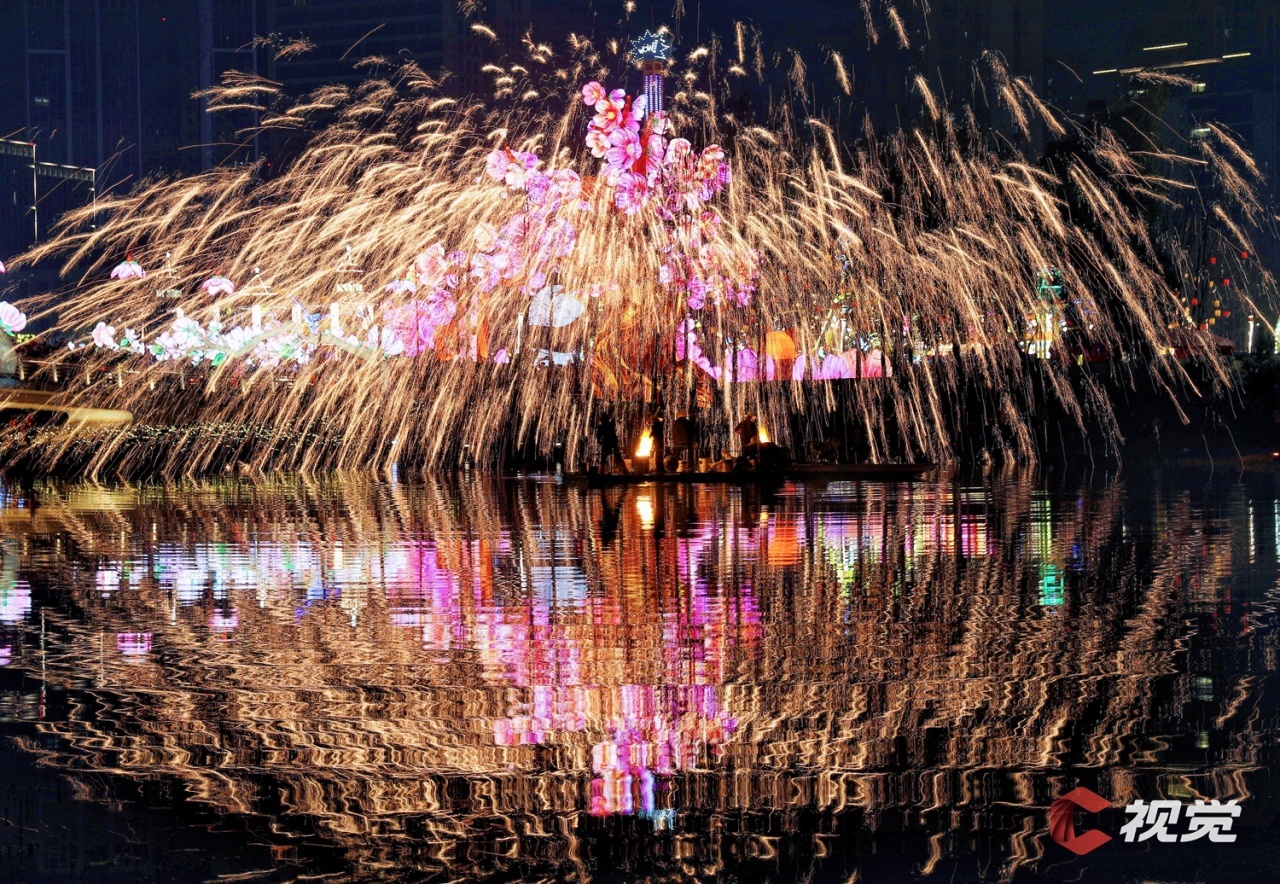 2月21日晚,成都市龙泉驿区东安湖溪峰岛,第55届成都国际熊猫灯会现场上演非遗打铁花,吸引众多游客前来游园。C视觉签约摄影师 王金城 摄