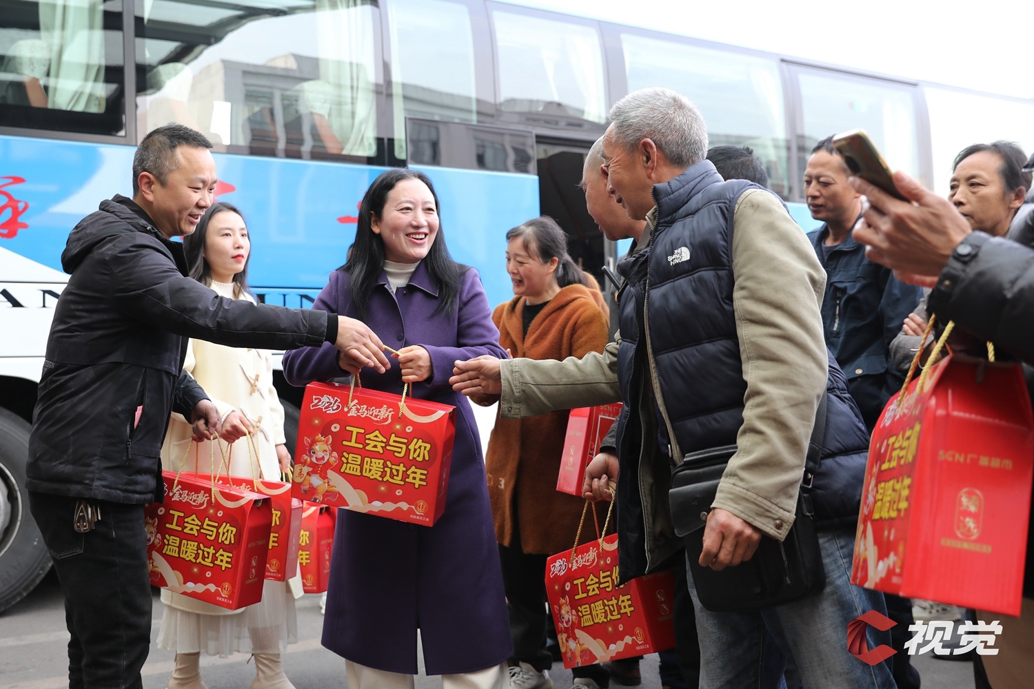2月22日,广安市武胜县的106名务工人员领取到工会发放的“家乡礼包”,准备乘坐开往广东的返岗专车。C视觉签约摄影师 夏俊林 摄