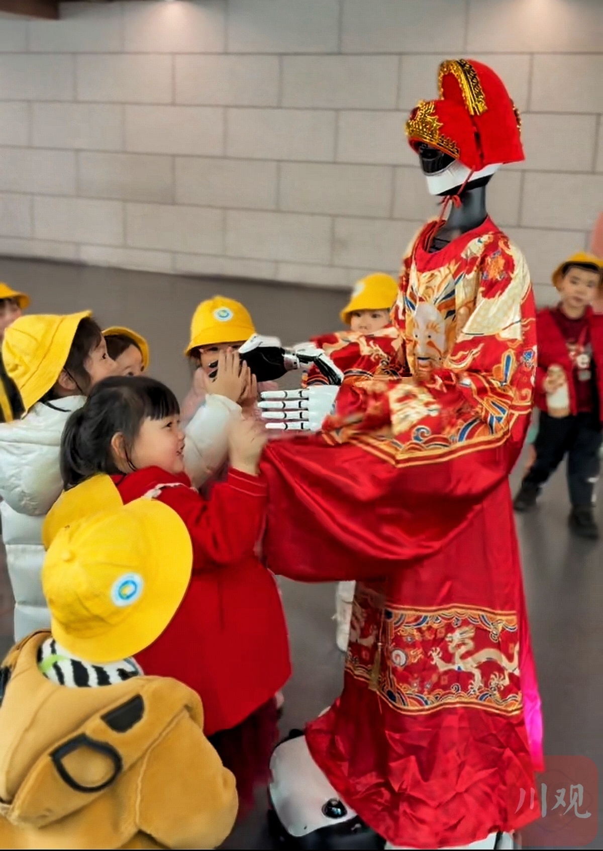 人形智能机器人“小芯”身着喜庆财神服饰亮相馆内。