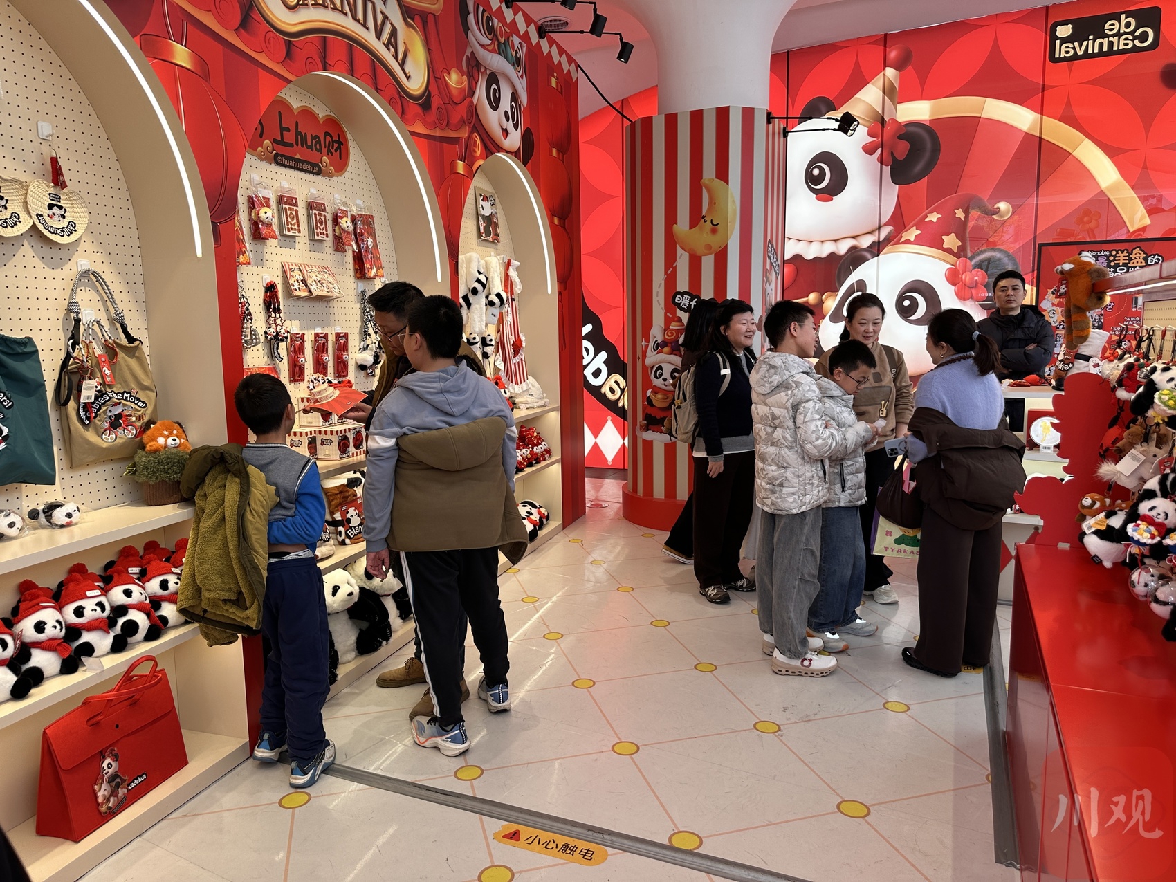 huahuadehua快闪店在春节前夕入驻万象城,作为突破旅游周边定式的品牌,huahuadehua正在用资产运营视角深耕熊猫IP,门店除了熊猫毛绒玩具外,还有小熊猫玩偶、潮流包挂、水杯、手工扇、联名饼干、联名火锅底料等生活类潮流周边。