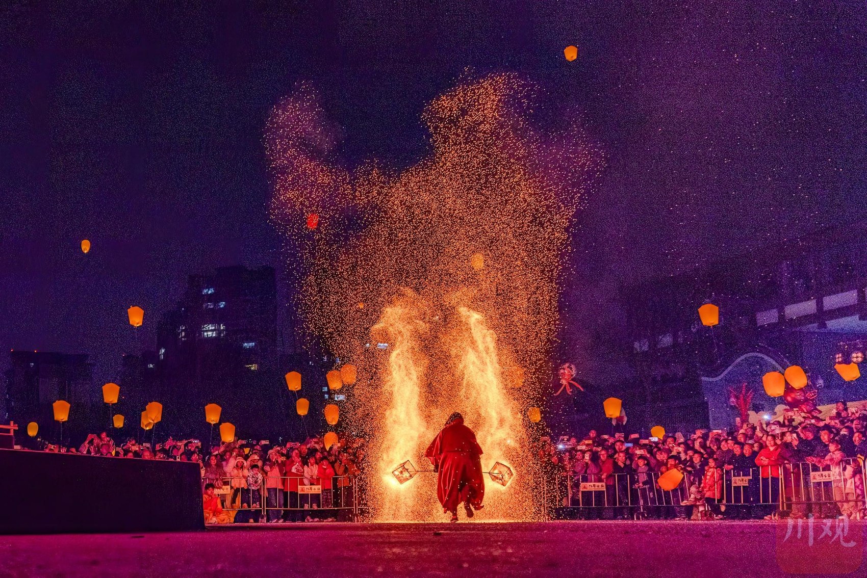 2026年成都洛带古镇灯火如昼,非遗打铁花精彩上演,与漫天的孔明灯交相辉映,营造出浓郁的新春氛围。C视觉签约摄影师 林漫 摄