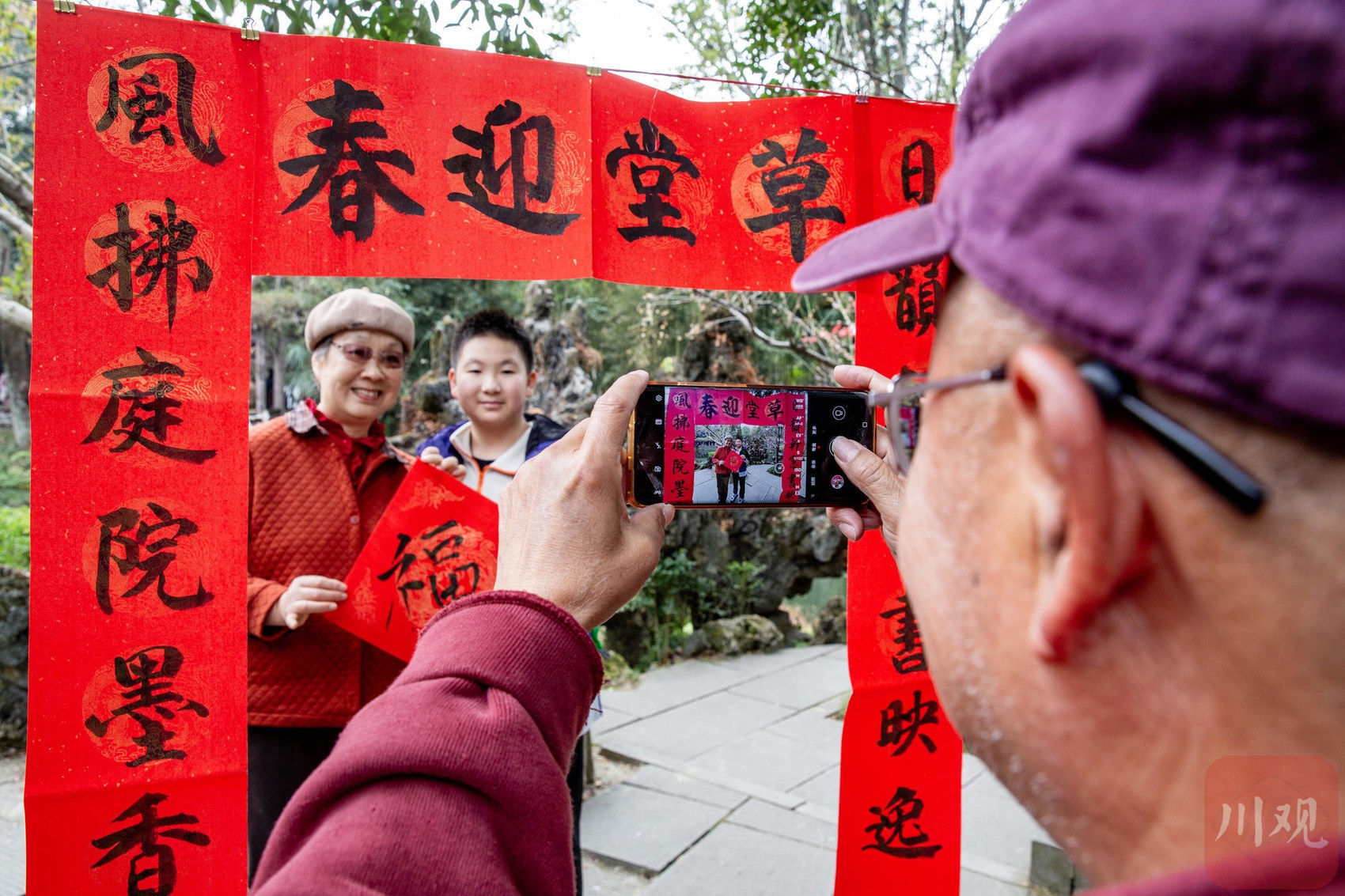 2月23日 “人日”,成都杜甫草堂内,市民在 “草堂迎春” 春联景观前拍照留念,定格新春诗意。C视觉签约摄影师 龚全意 摄
