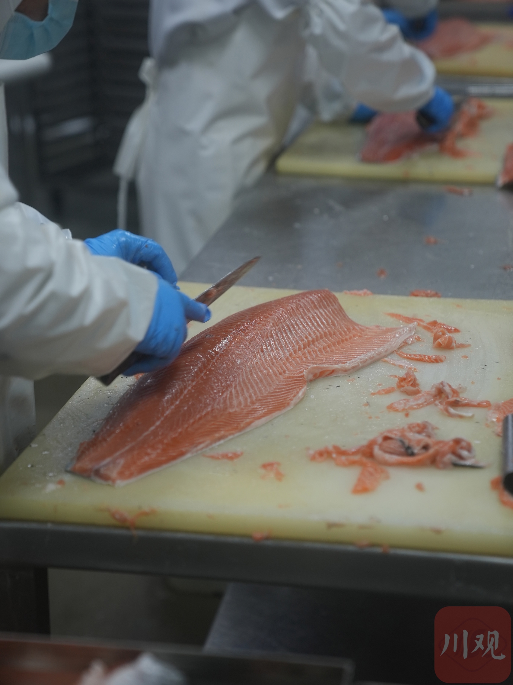 2月23日,农历正月初七,在位于成都双流区西部生鲜港的四川美沿远洋食品有限公司里,进口冰鲜三文鱼加工生产线满负荷运转。一条条重达约7公斤的冰鲜三文鱼不停被运转上产线,数十名工人熟练地进行开片、修整、分切、封装、X光检查等工序,最后经过贴标的生鲜立即被发往成都各大商超和料理店。