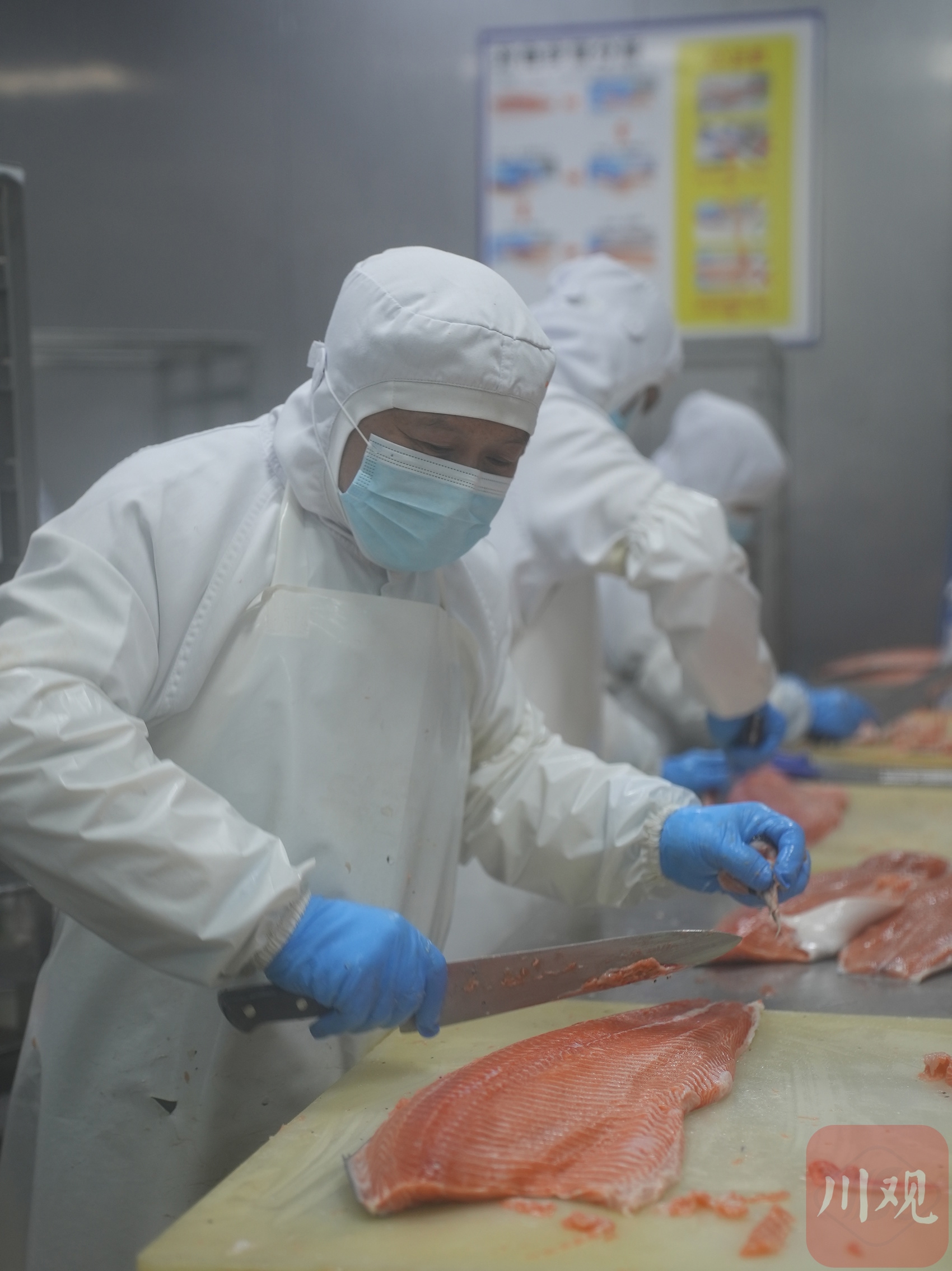 2月23日,四川美沿远洋食品有限公司,工人对三文鱼肉进行修腹膜处理。