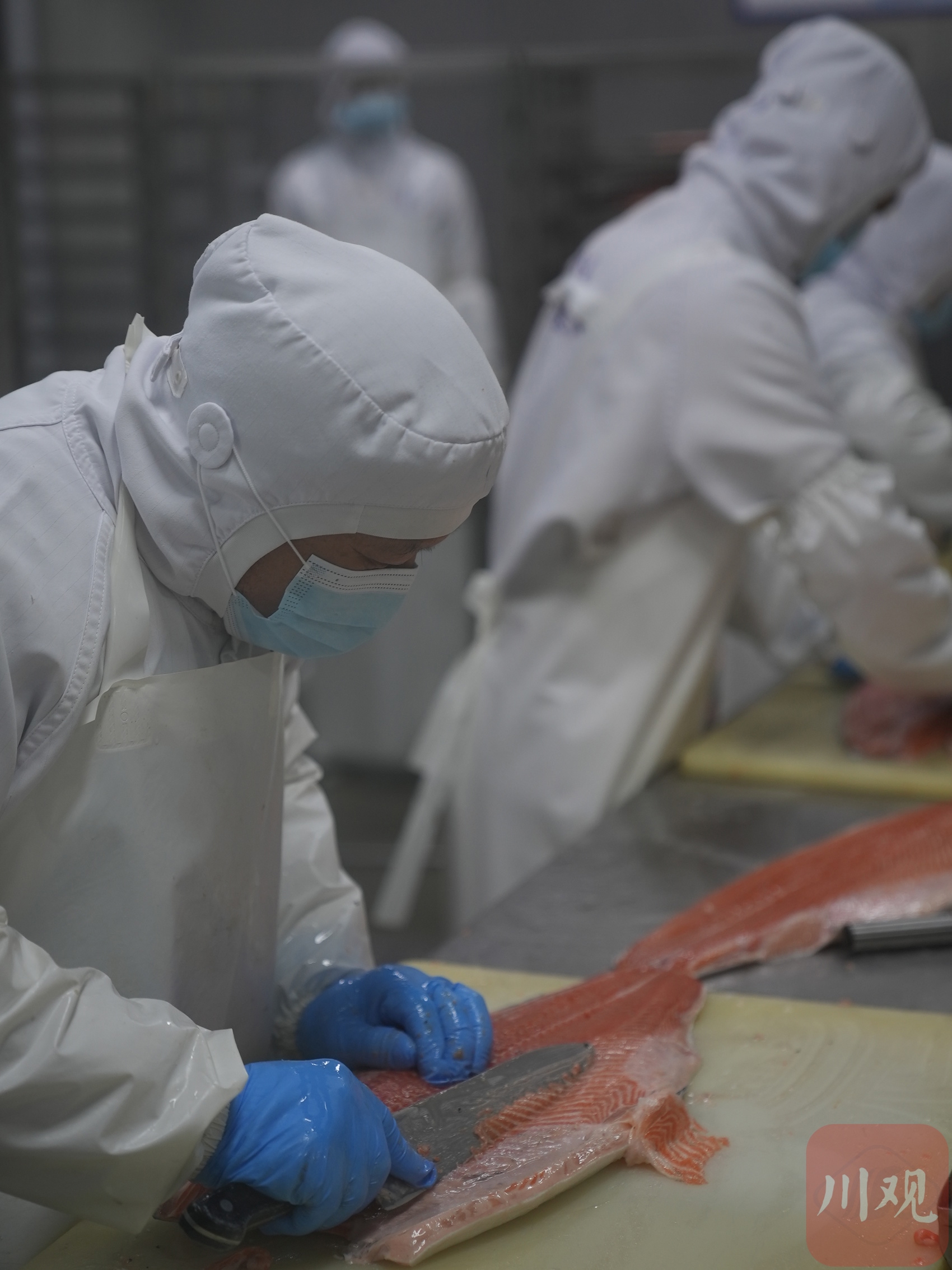 2月23日,四川美沿远洋食品有限公司,进口冰鲜三文鱼加工生产线满负荷运转,工人对三文鱼进行切头处理。