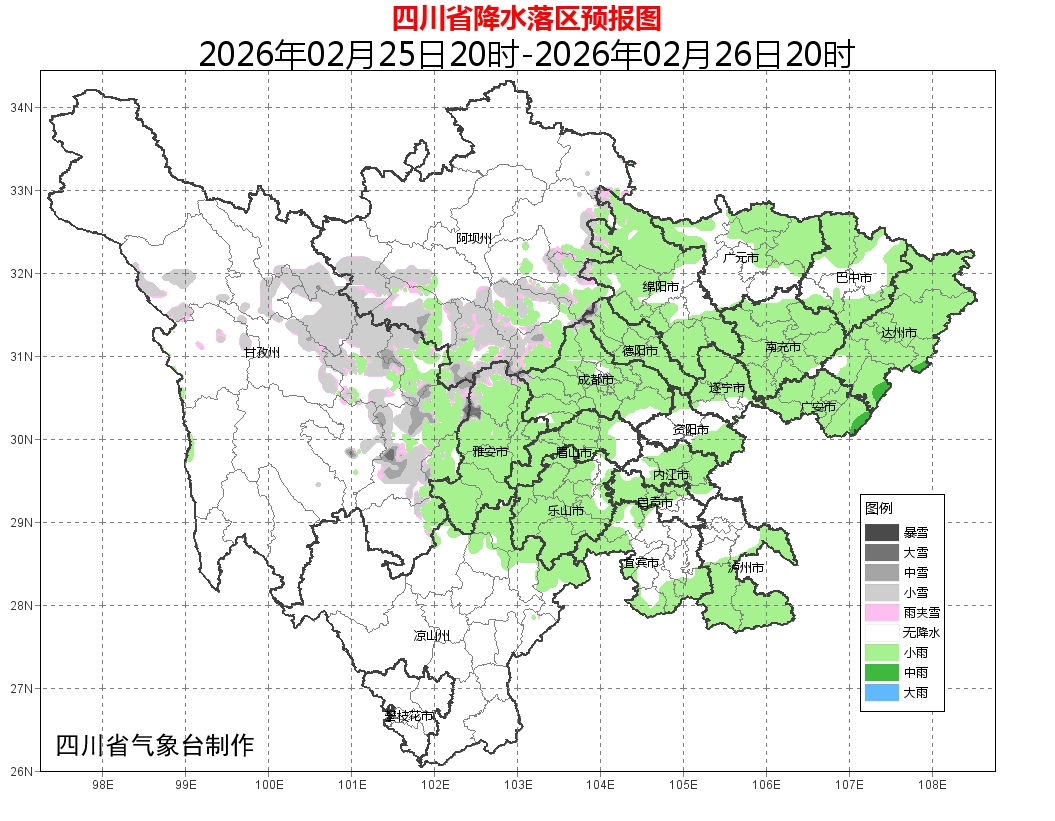 26日晚上到27日白天:盆地大部多云间阴,西北部和西南部有分散小雨;川西高原东部和凉山州东北部多云间阴天有分散阵雪(雨),川西高原和攀西地区其余地方多云间晴。