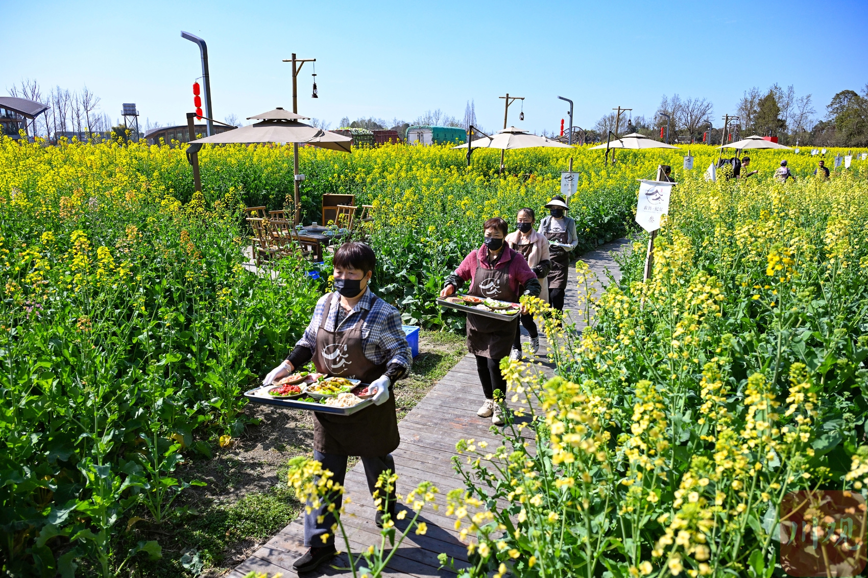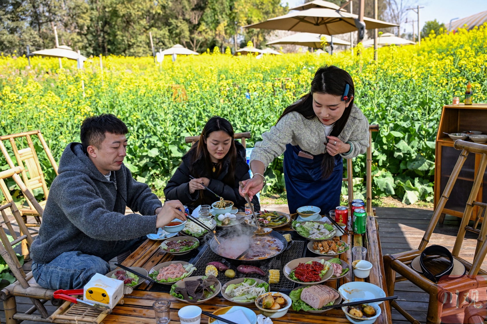2026年2月24日,成都天气晴好。记者在位于成都市新津区的天府农博园看到,大片油菜花争相开放,数十张火锅桌错落有致地摆放其间,吸引了不少游客前来体验“花田火锅”。在明媚的田园春景中,这种新场景的营造,为游客带来了视觉与味觉的双重享受。