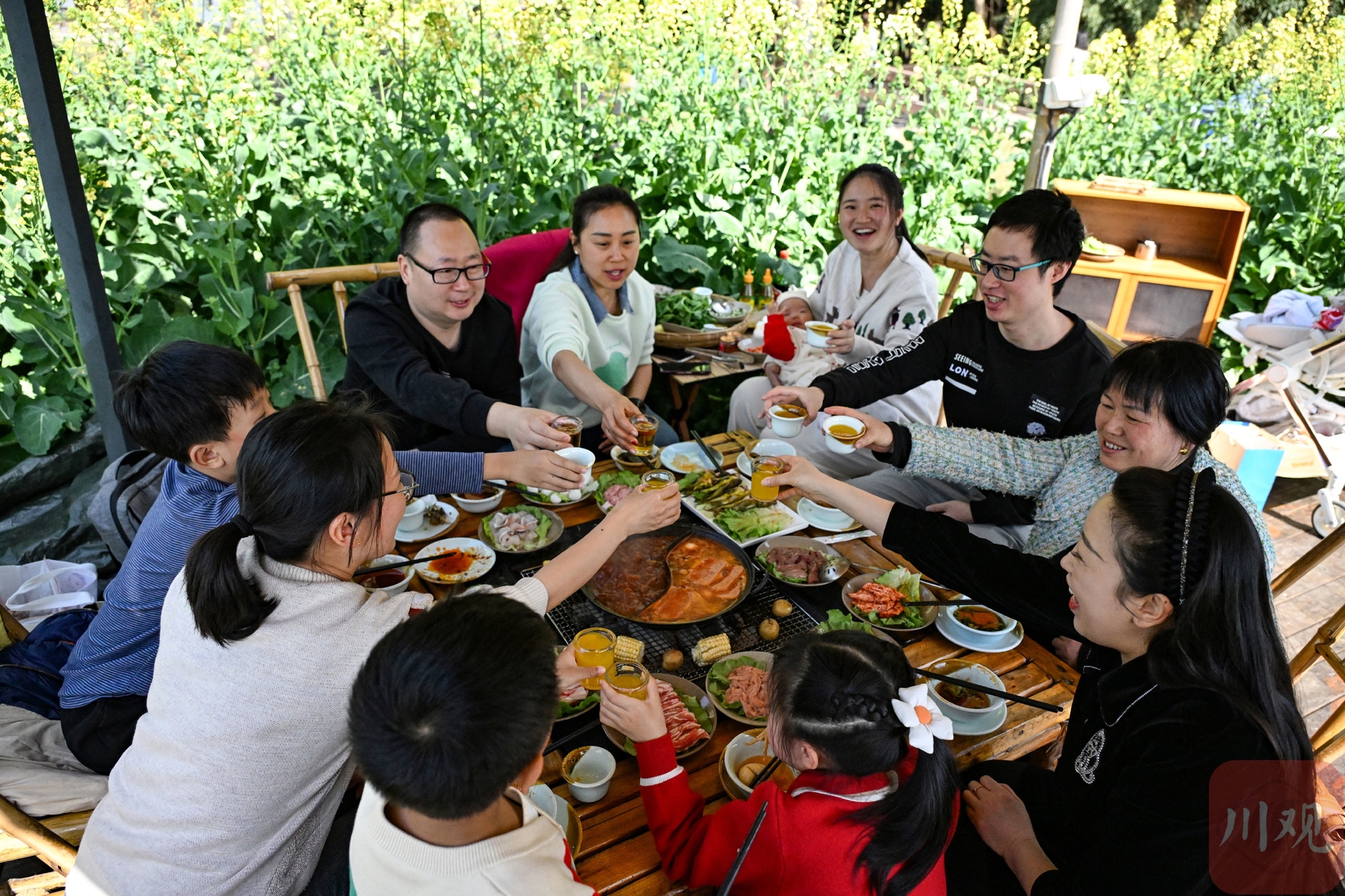 2026年2月24日,在位于成都市新津区的天府农博园,游客在花海中品尝“花田火锅”。