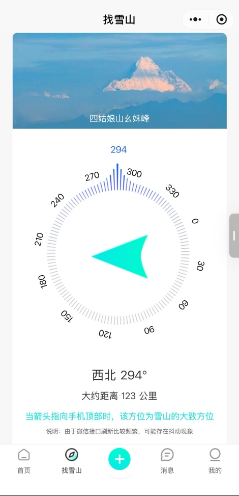 不用再凭感觉摸索!系统自带智能定位与指南针功能,自动抓取你的实时坐标,快速匹配距离最近的雪山——无论是贡嘎雪山的雄奇、西岭雪山的秀美,还是四姑娘山的灵动,都能清晰显示方位、坐标及公里数,让每一次追雪都少走弯路、直达美景。
