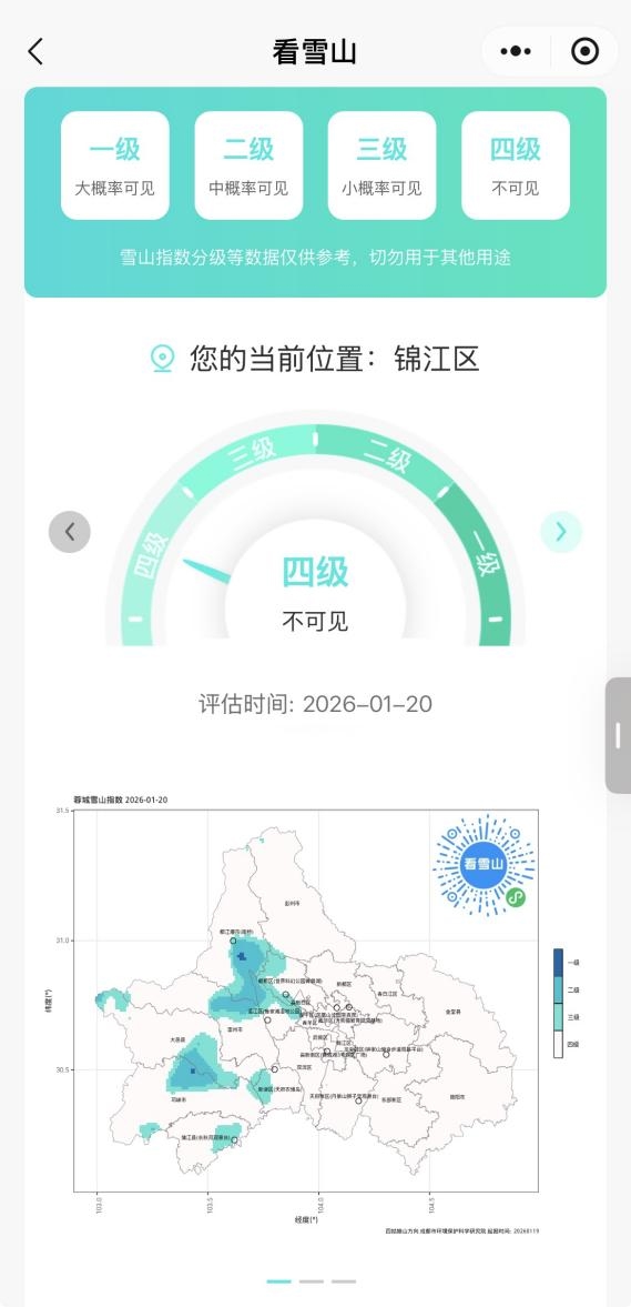 想追雪山却怕“扑空”?“雪山指数”板块帮你精准避坑!系统会发布当日及未来两天的雪山可见度等级:一级大概率可见、二级中概率可见、三级小概率可见、四级不可见,直观预判美景是否可期,精准拿捏追雪时机,不用再为“等不到雪山”而遗憾,轻松解锁“抬头见雪”的惊喜。