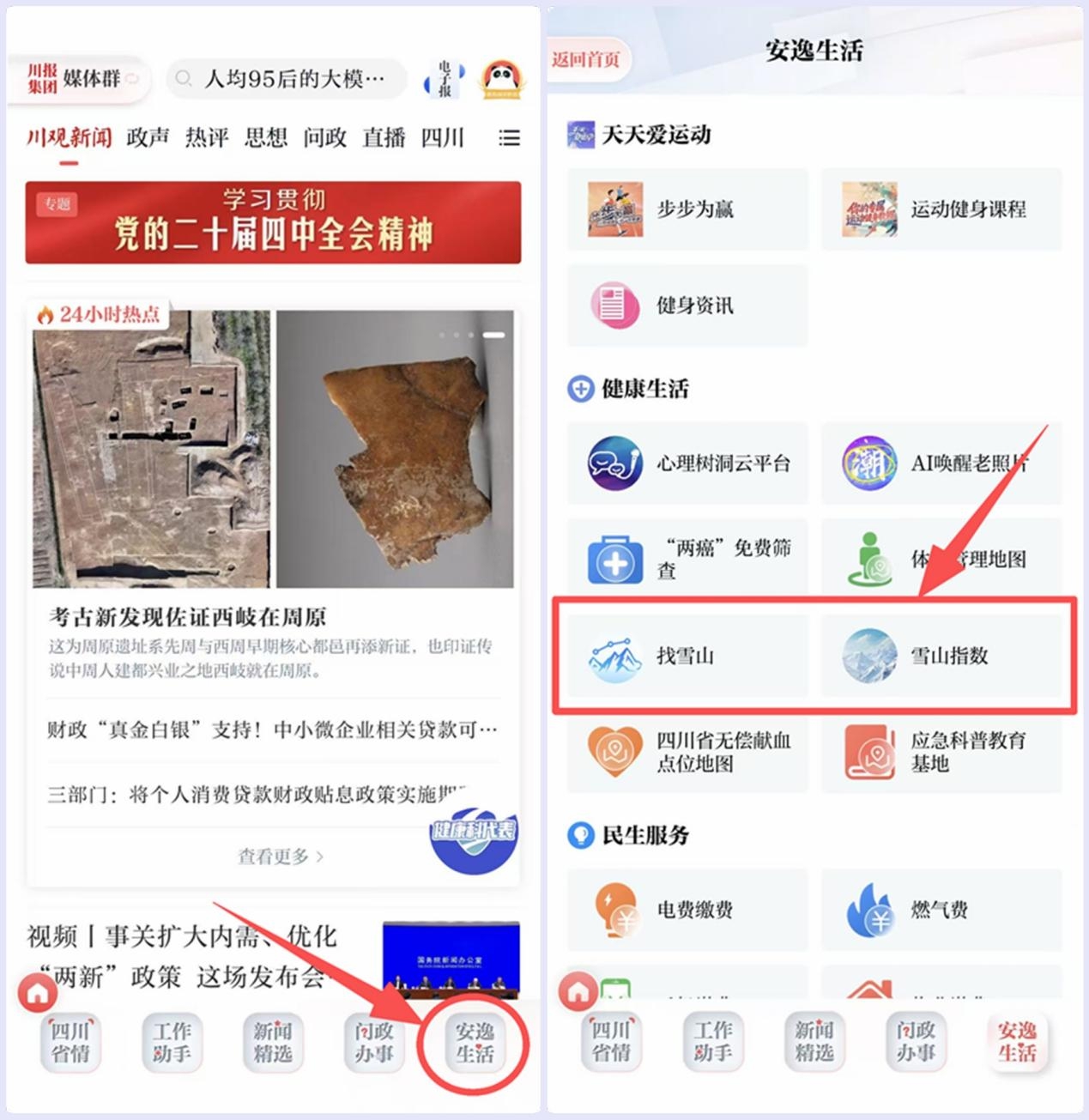 第二步:在川观新闻首页,点击右下方【安逸生活】—【健康生活】,找到【找雪山】【雪山指数】图标,点击即可查询;