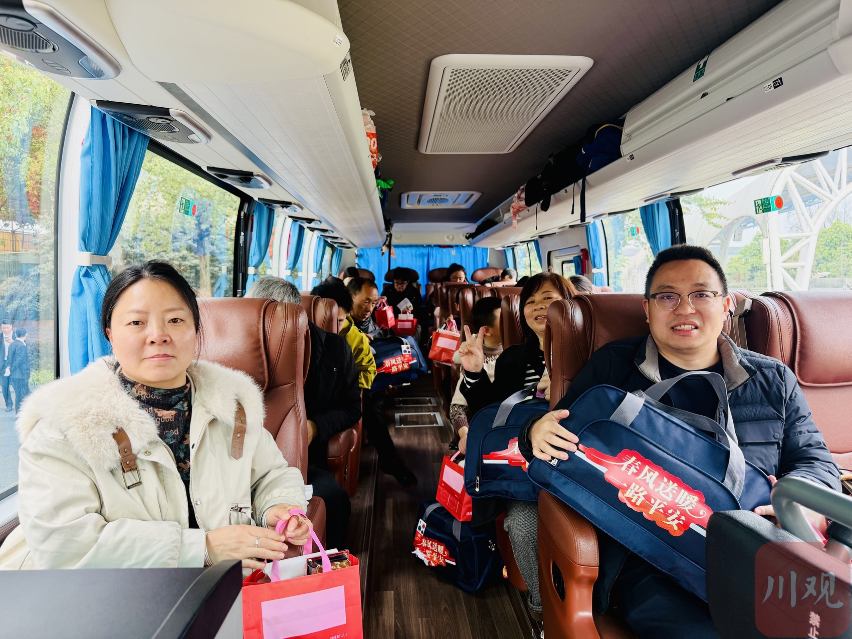 来自叙永的黄仲兰则是一上车就发现了惊喜。“你看嘛,座位上不仅提前准备了午餐,还有个贴着‘春风送暖 一路平安’的礼包,太贴心了!”黄仲兰在南京做餐饮一年多,也是第一次体验集体返岗。在她看来,一路上和老乡们唠唠嗑、话话家常,时间过得飞快,直接就能到岗位,再也不用自己折腾转车了。