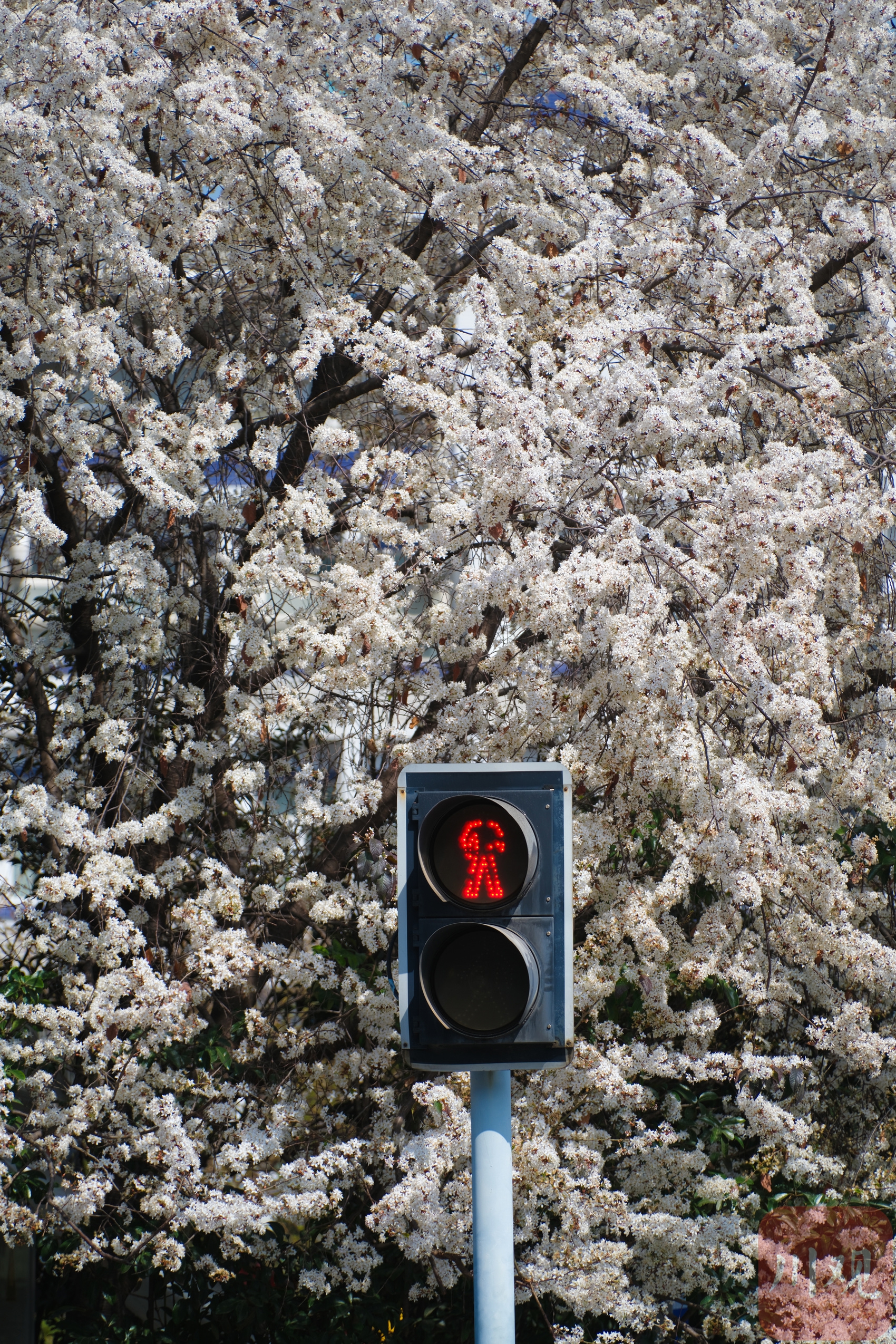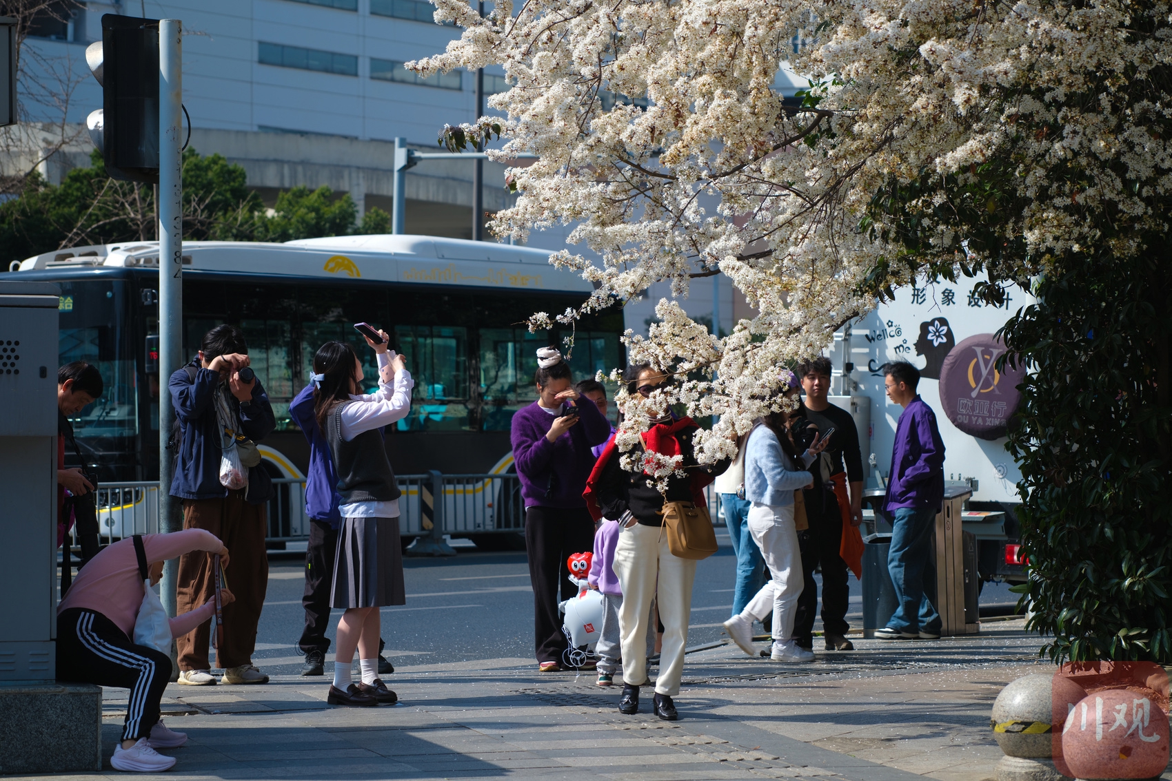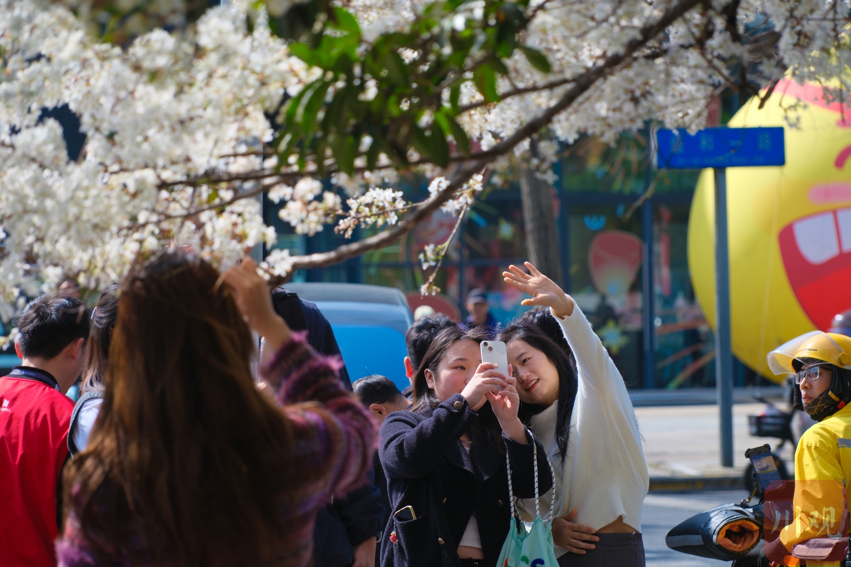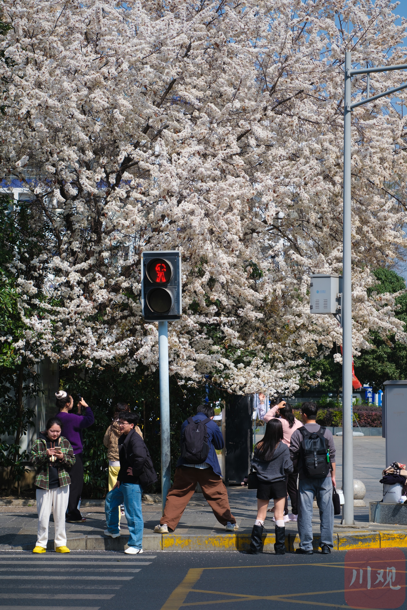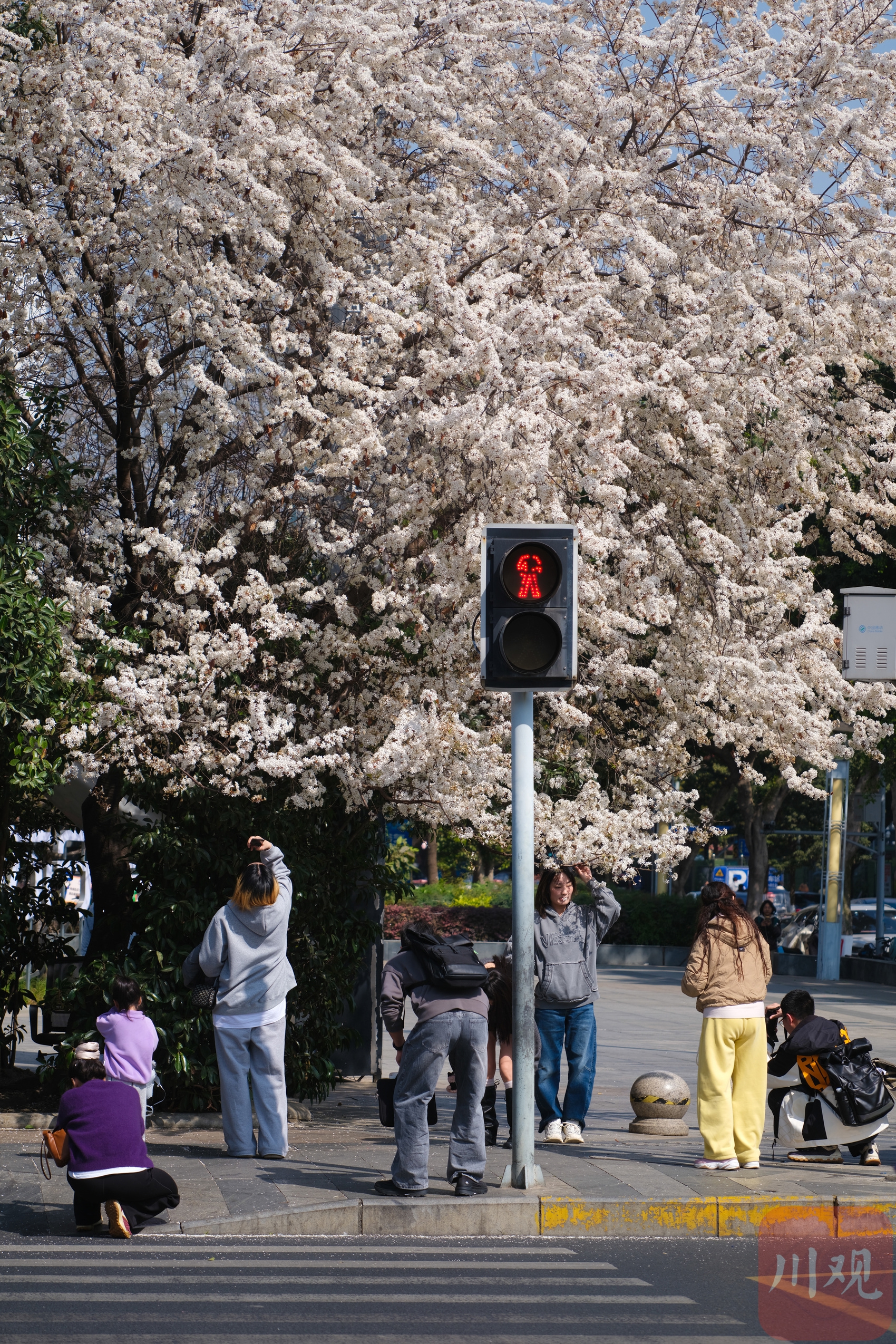 2月25日,成都高新区盛和一路路口的樱花树开始绽放,层层花瓣在天空泛着柔和的色调。这棵树在社交媒体上迅速走红,成为市民新晋打卡热点。微风吹过,花枝轻轻摇曳,花瓣随风飘落,形成零散的纹理和自然的层次感。粉嫩的花朵吸引市民前来拍照留念,成为街头一道醒目的春日景观。