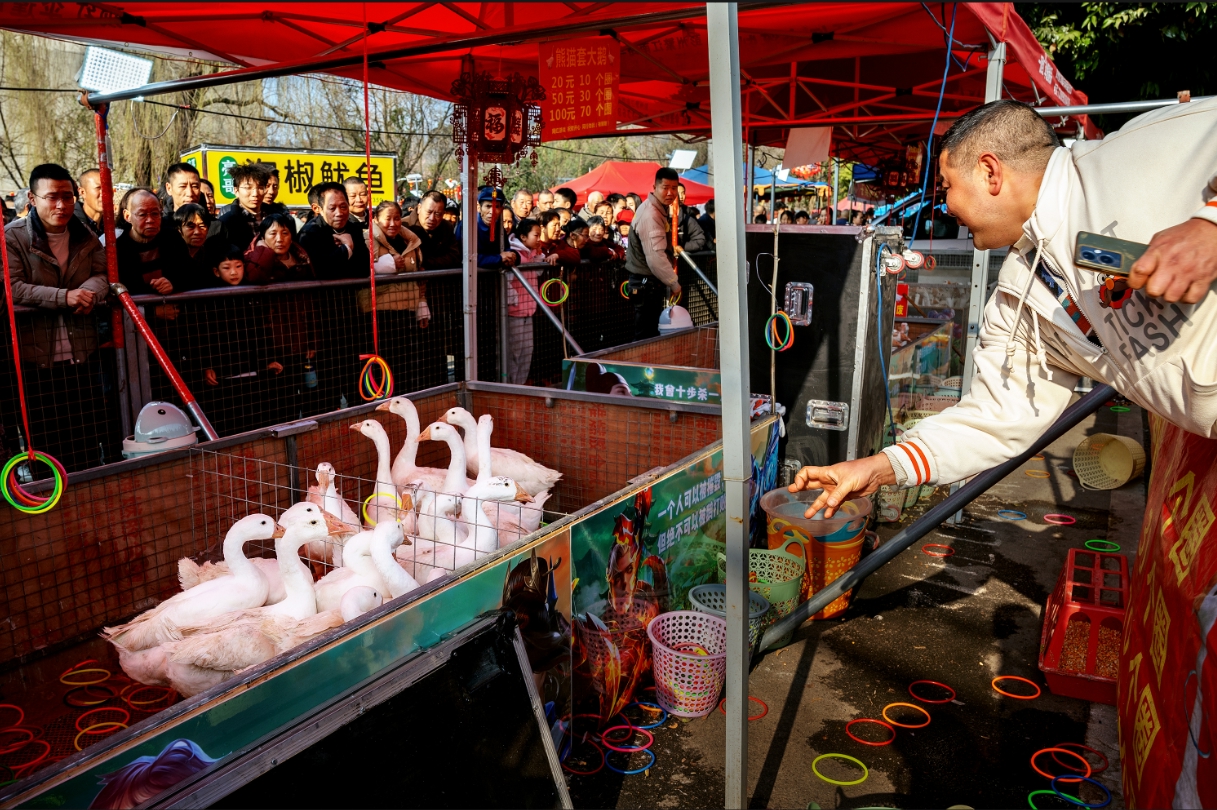 作品简介:彭州关口“棒棒会”人山人海,热闹非凡。图为一位游客正在甩圈套鹅,吸引众多游客围观。
