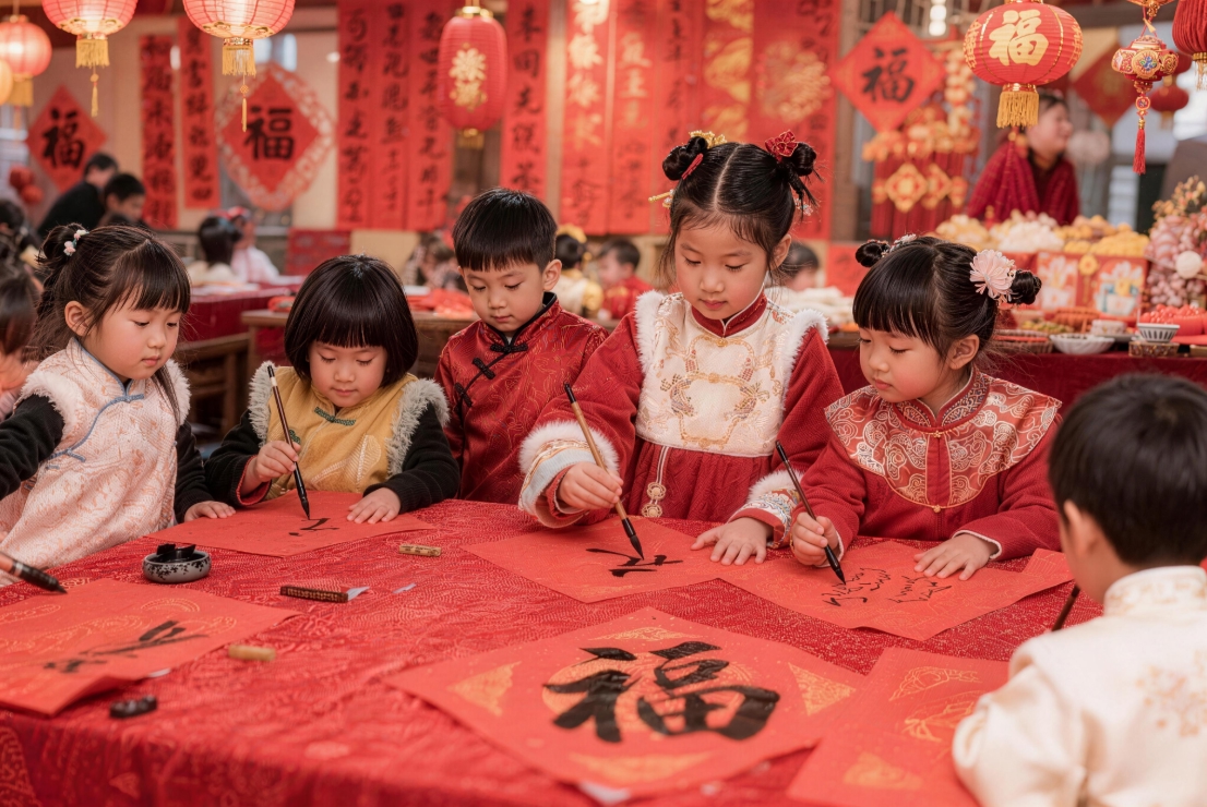 作品简介:画面以“墨香”为魂,氤氲的笔触与古韵悠长的灯笼、窗花相映成趣,而孩童清澈眼眸与专注神态,将传统书法的庄重与童真的灵动完美交融。