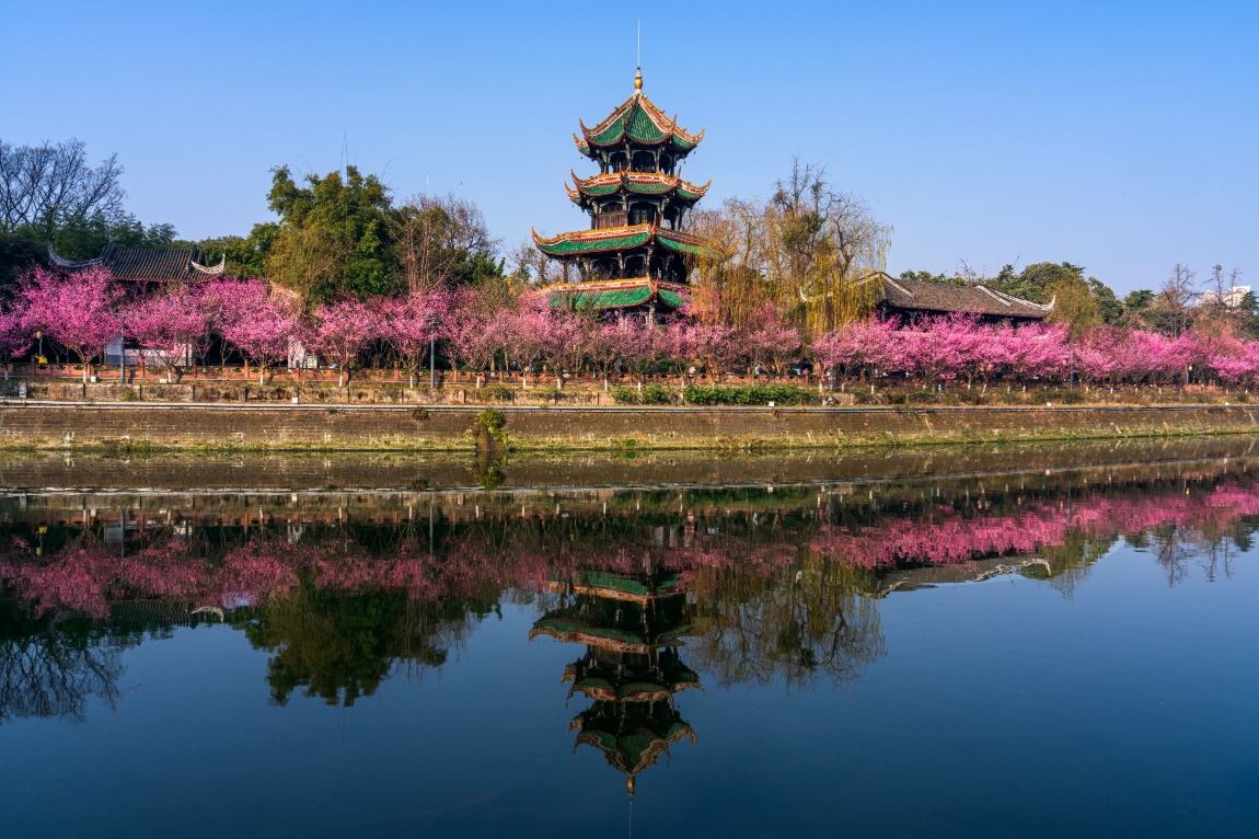 作品简介:锦江春暖,望江楼前梅开成海,古阁倒影入波,一派诗意盎然。