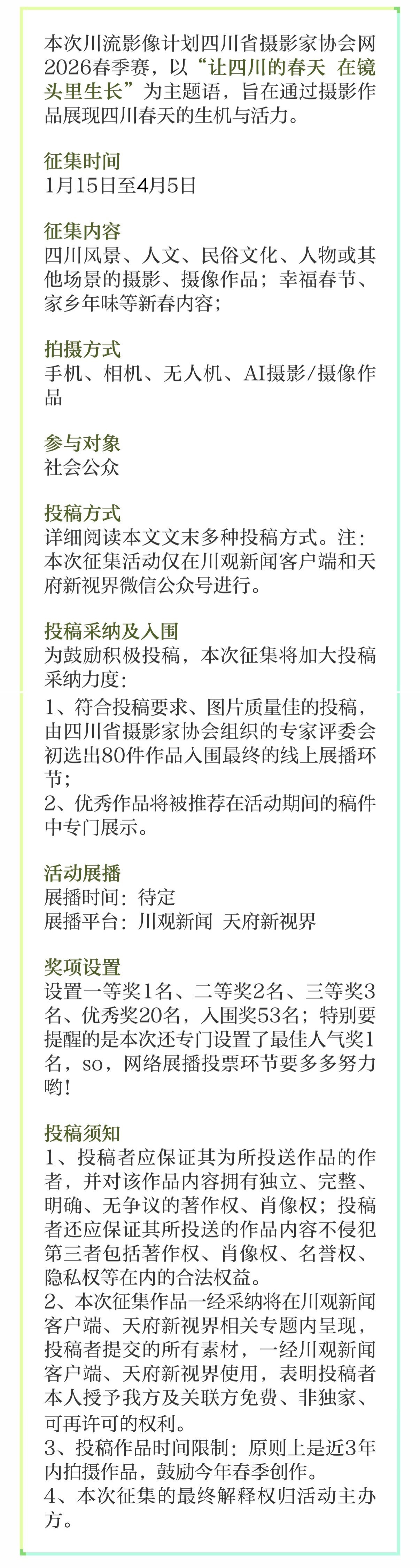 本次“春季赛”原计划投稿截止日期3月5日,恰好是惊蛰节气,为了展现天府之春更多绚丽多彩的画卷,特将投稿截止日期延期至4月5日,请大家抓紧时间投稿哦~