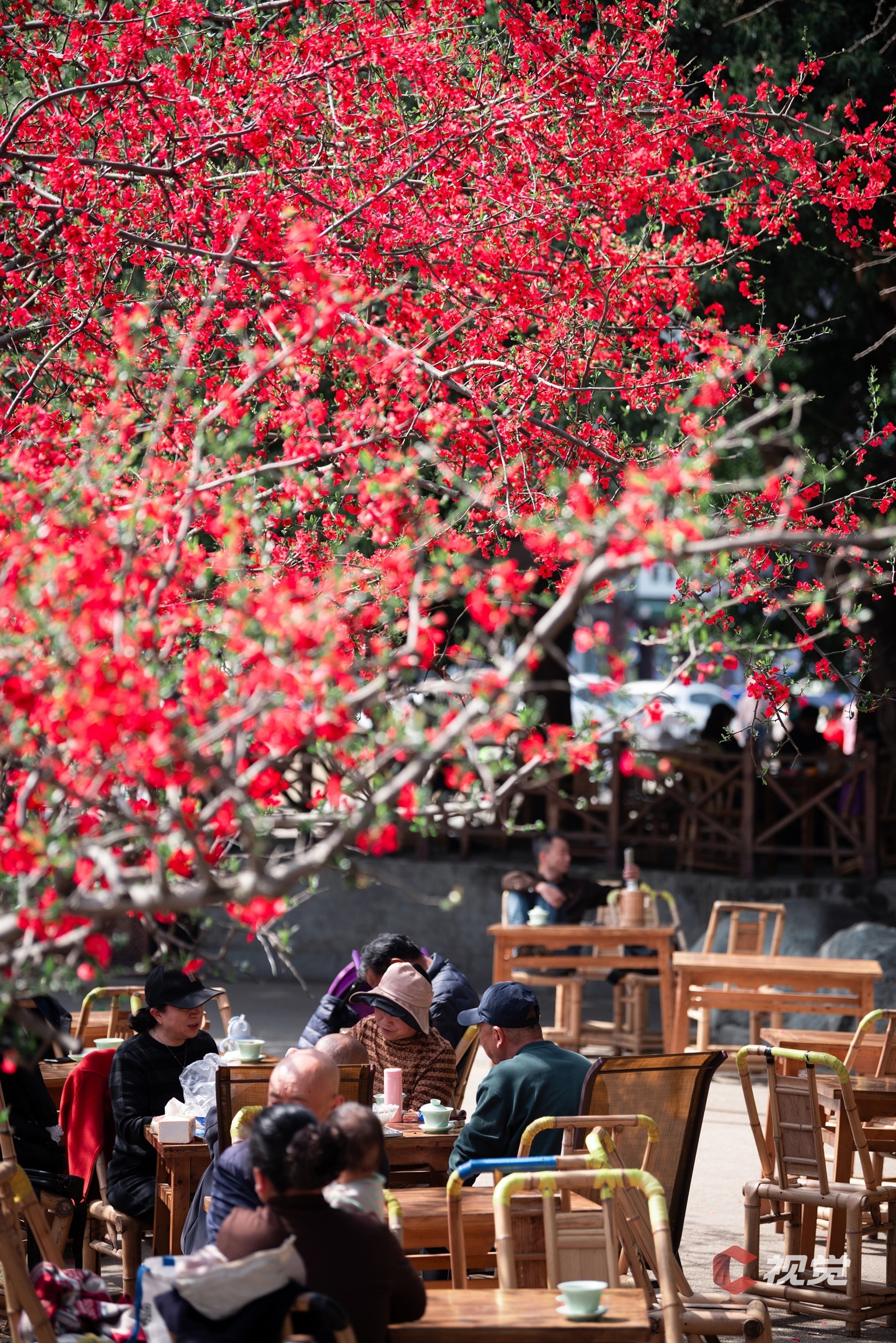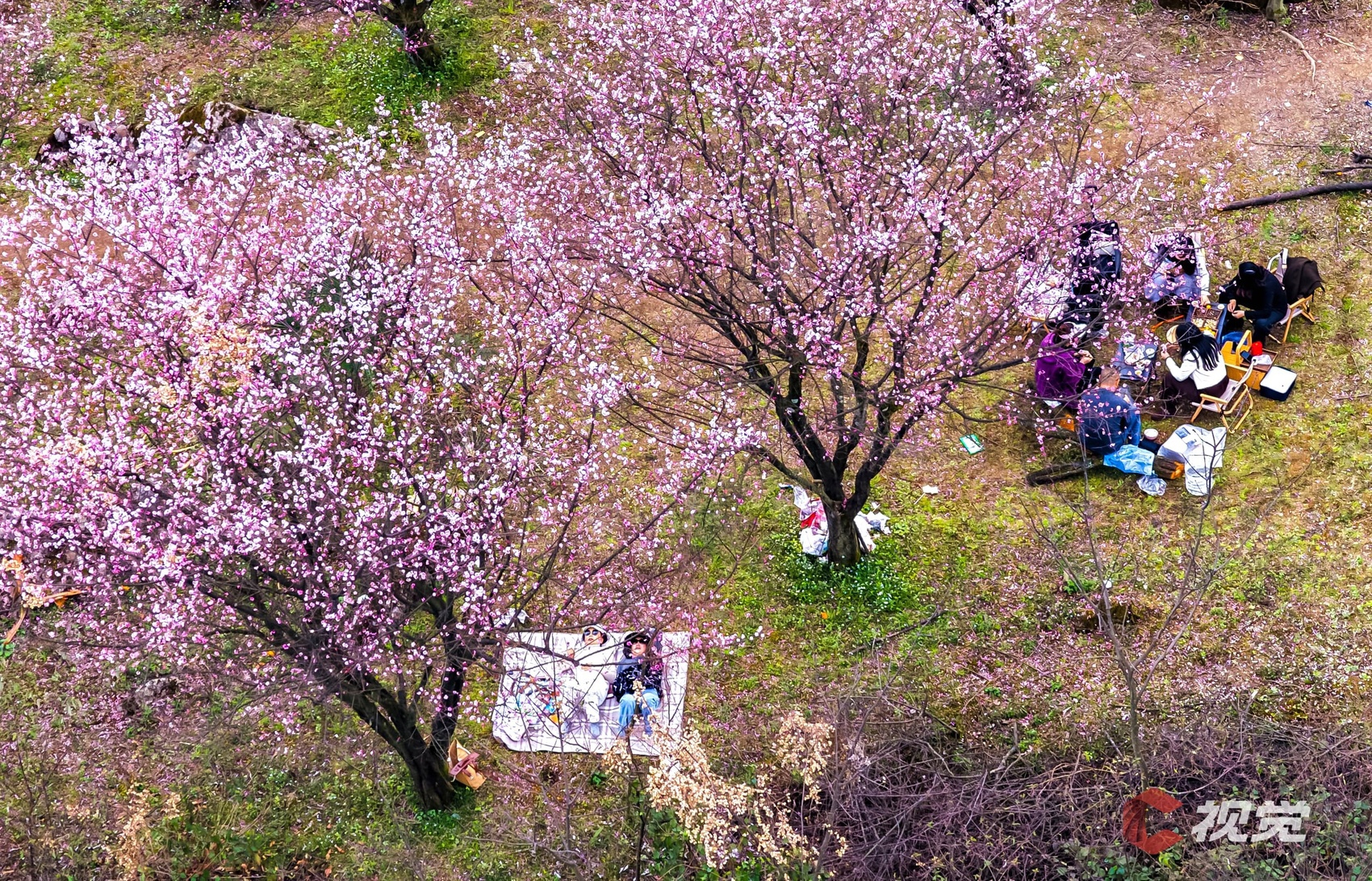 2月24日,成都大邑县鹤鸣镇大坪村梅花李花盛开,枝头繁花似锦,树下游客悠闲享受春天。C视觉签约摄影师 黄加荣
