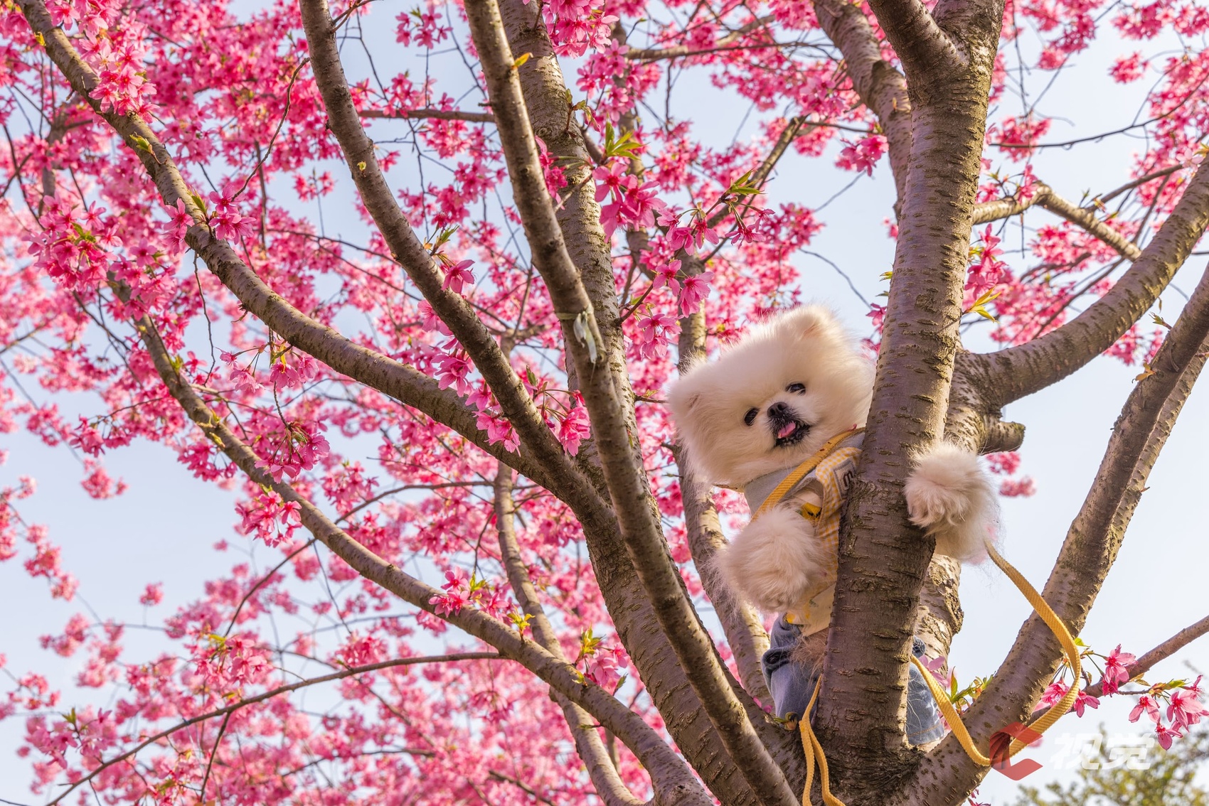 2月26日,成都漫花庄园樱花盛开,一只小狗趴在树枝上,与春天同框合影。C视觉签约摄影师 林漫