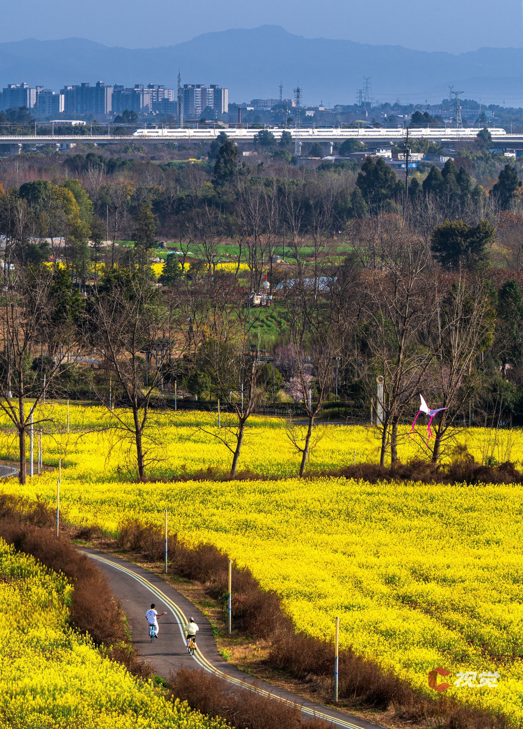 2月25日,成都三圣乡油菜花海中,两名骑行者正在放风筝,远处高铁疾驰而过。C视觉签约摄影师 安咏涛
