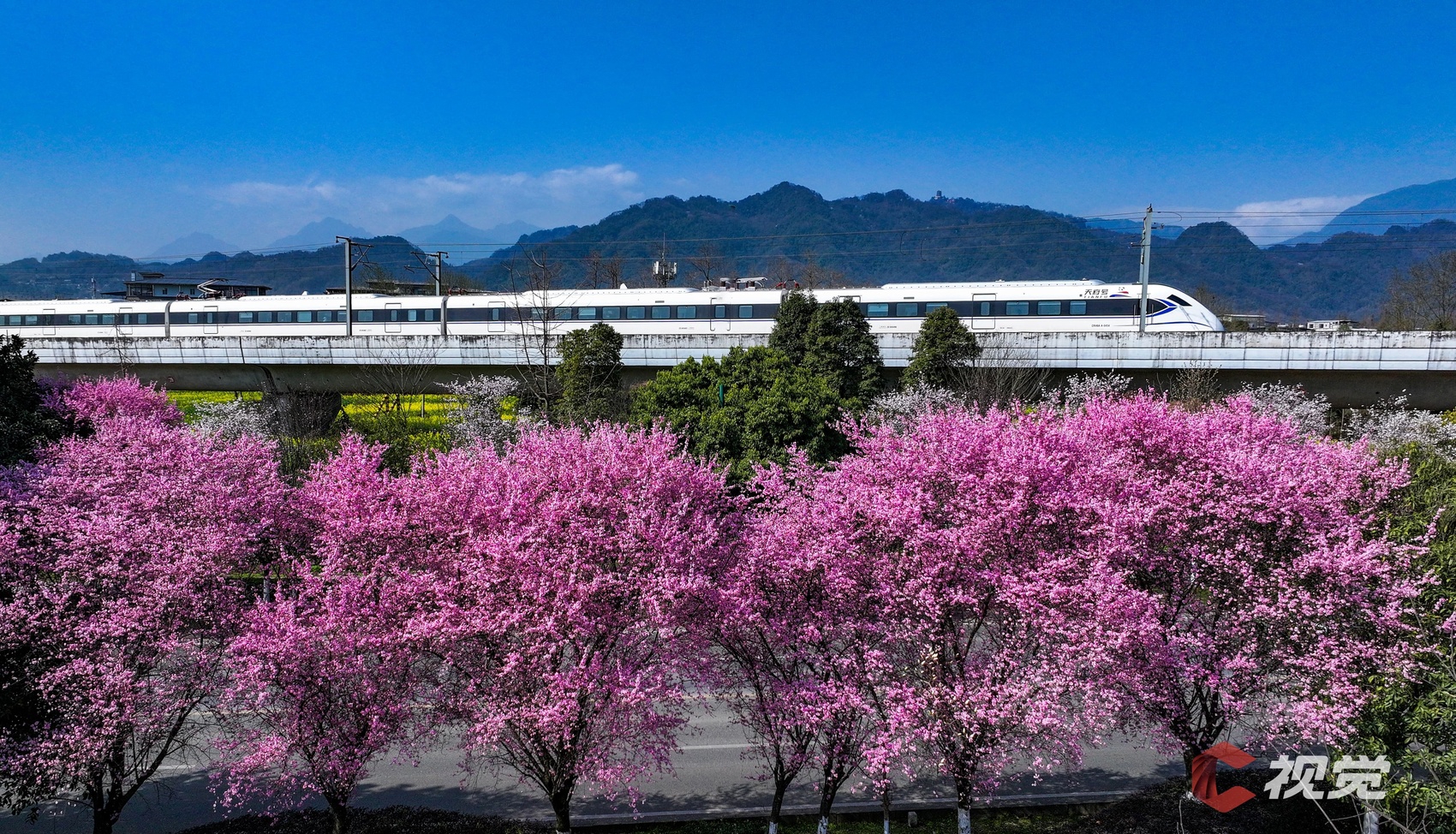 2月25日,青城山开往成都的高铁从粉色花海中穿过。C视觉签约摄影师 邬宪初
