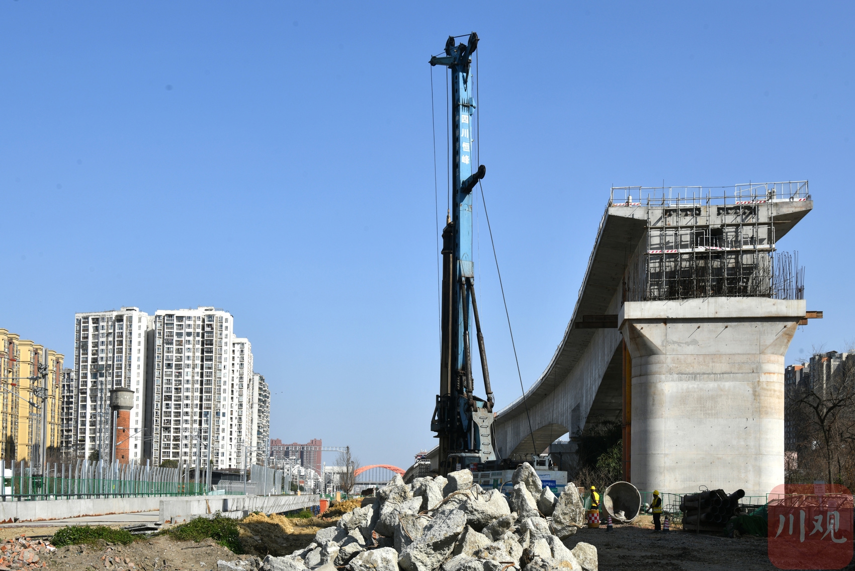 此次记者来到的建设现场,就是成渝中线进出站的最后一段路。这段路中不止成渝中线高铁一条路,在宽约50米的范围内,包括成渝中线两条铁轨在内,共有9条铁路线一字排开;在长约1.2公里的区间里,铁路线需要跨越沙河、繁忙的市政道路。铁路线两侧还有不少居民区。