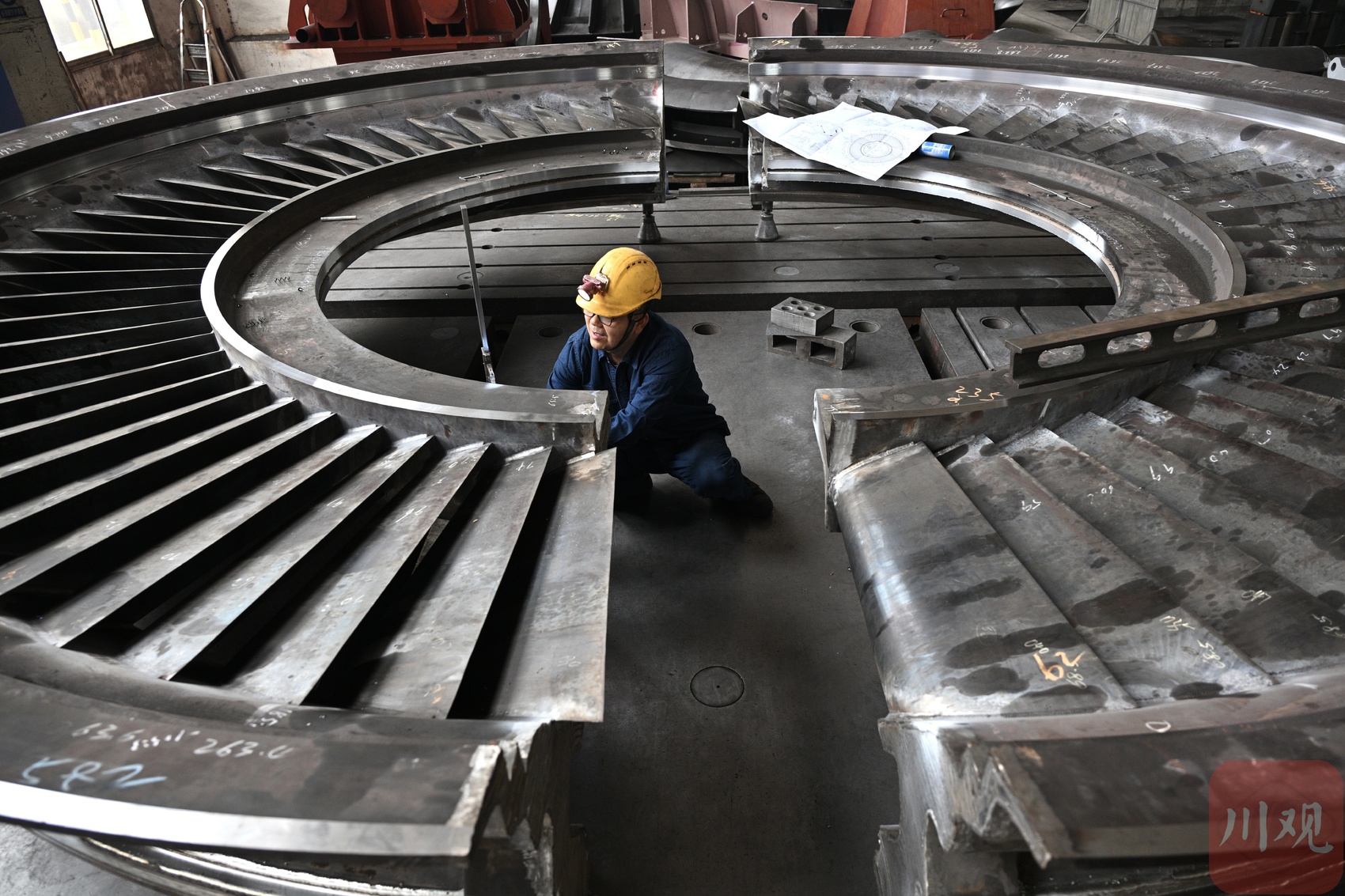 工人进行汽轮机隔板划线。
