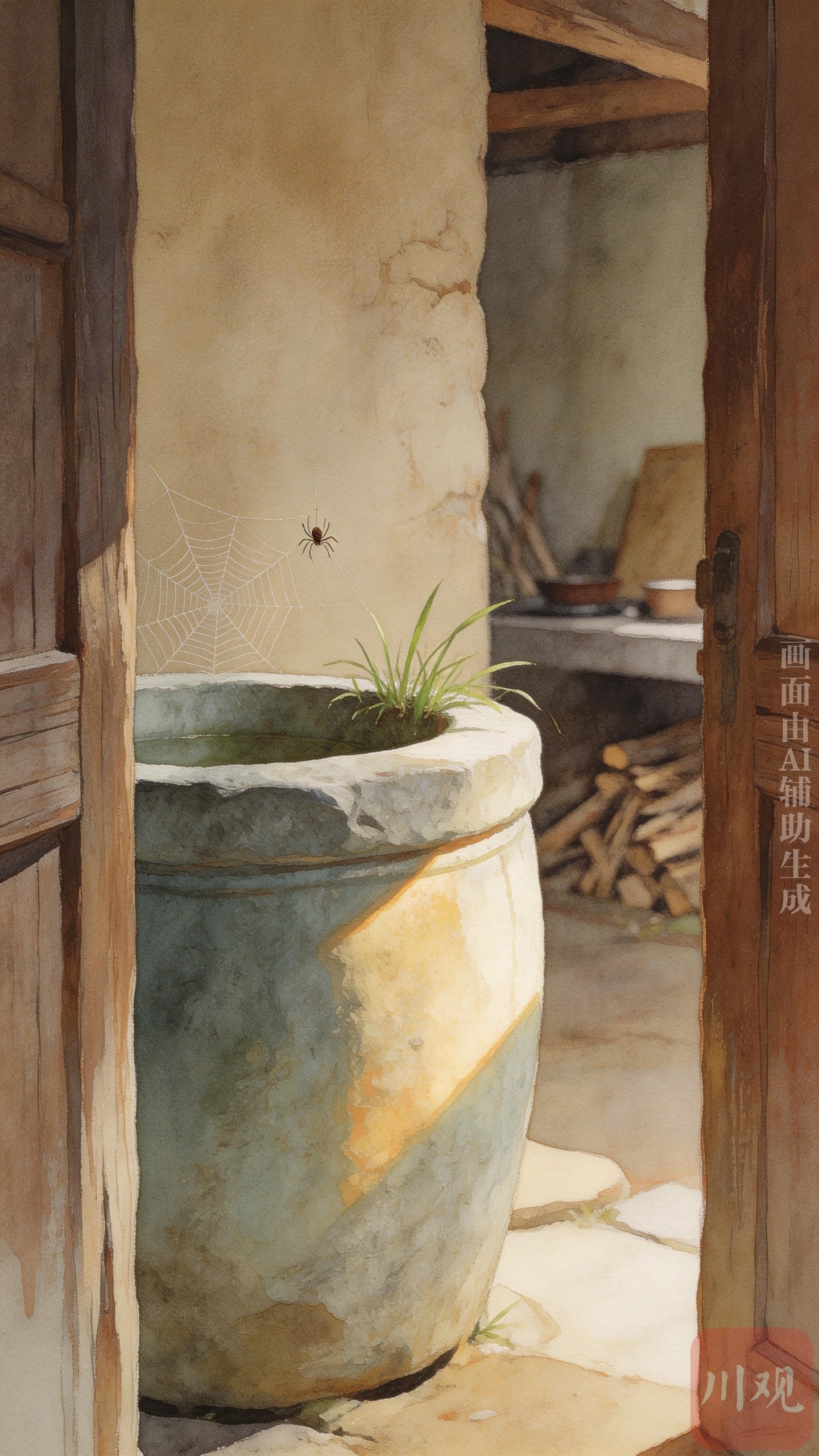 日前回乡,打开斑驳木门,特意去伙房看了一眼石缸。只见点点斜阳从屋顶破瓦间漏下,石板灶台裂开多个小口,蜘蛛在空中织就新的经纬,而石缸依旧蹲于阴凉角落,沉默如初。凑近细看,坚实缸体居然长出一棵野草来,那细茎托着叶片,在穿堂风里轻轻摇晃。没成想,裂缝间不知不觉积下的尘土,竟然成为草籽安眠的温床。我突然觉得,这是当年留下的锤印在岁月土壤里生了根、发了芽,那些被铁錾震落的星辰,终以另一种形态重归大地。