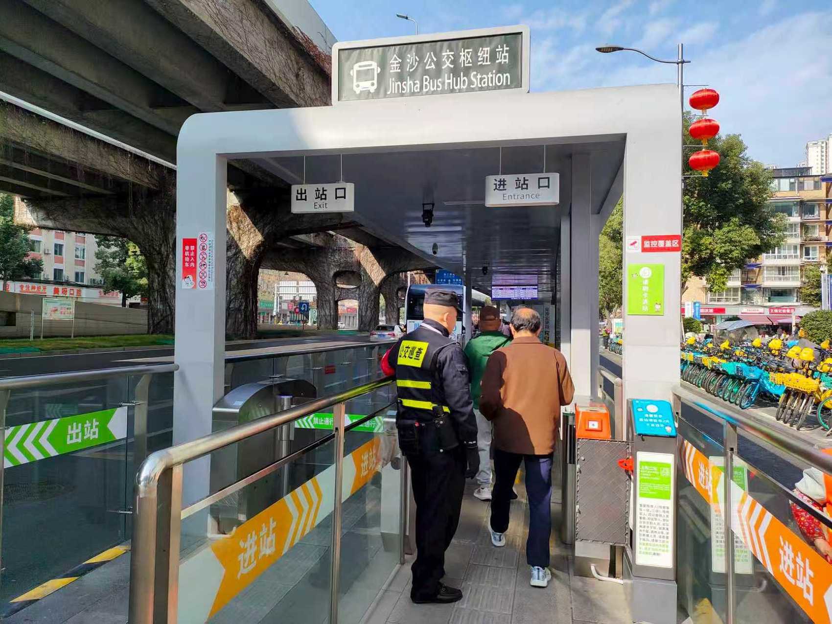 地处蜀都大道清江中路与青羊大道交汇处的金沙公交枢纽站位,是地铁、BRT、常规公交等多种交通方式汇聚的重要换乘节点。成都公交集团运兴巴士有限公司调度长罗捷介绍,该站全天停靠公交班次约4100班,高峰时段接近1400班,全天客流登降量约4.5万人次,其中高峰时段就达到2万人次。