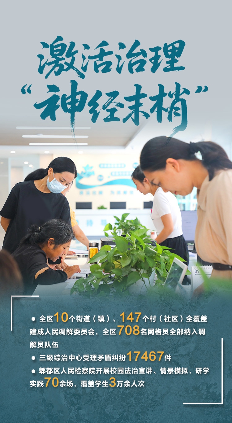 “张姐,关于小区加装电梯的事,咱们坐下来再聊聊。”在一里阳光小区的凉亭里,街道综治中心的调解员正耐心疏导邻里间的矛盾。此前,该小区因加装电梯的问题引起分歧,郫都区综治中心整合法治力量、释法明理,最终促成工程顺利复工。这是郫都区坚持和发展新时代“枫桥经验”的一个缩影。2025年,郫都区三级综治中心受理矛盾纠纷17467件,大量矛盾被化解在基层、消解在萌芽。