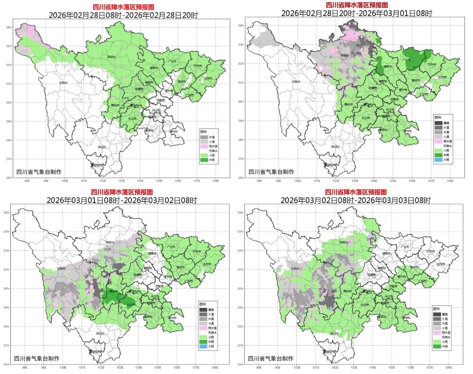 四川省气象台今天早间预报,2月28日至3月2日,盆地有一次降水天气过程,平均气温略有下降;川西高原和凉山州北部有阵雪或阵雨,局地中到大雪,需防范雨雪天气和道路结冰带来的不利影响。
