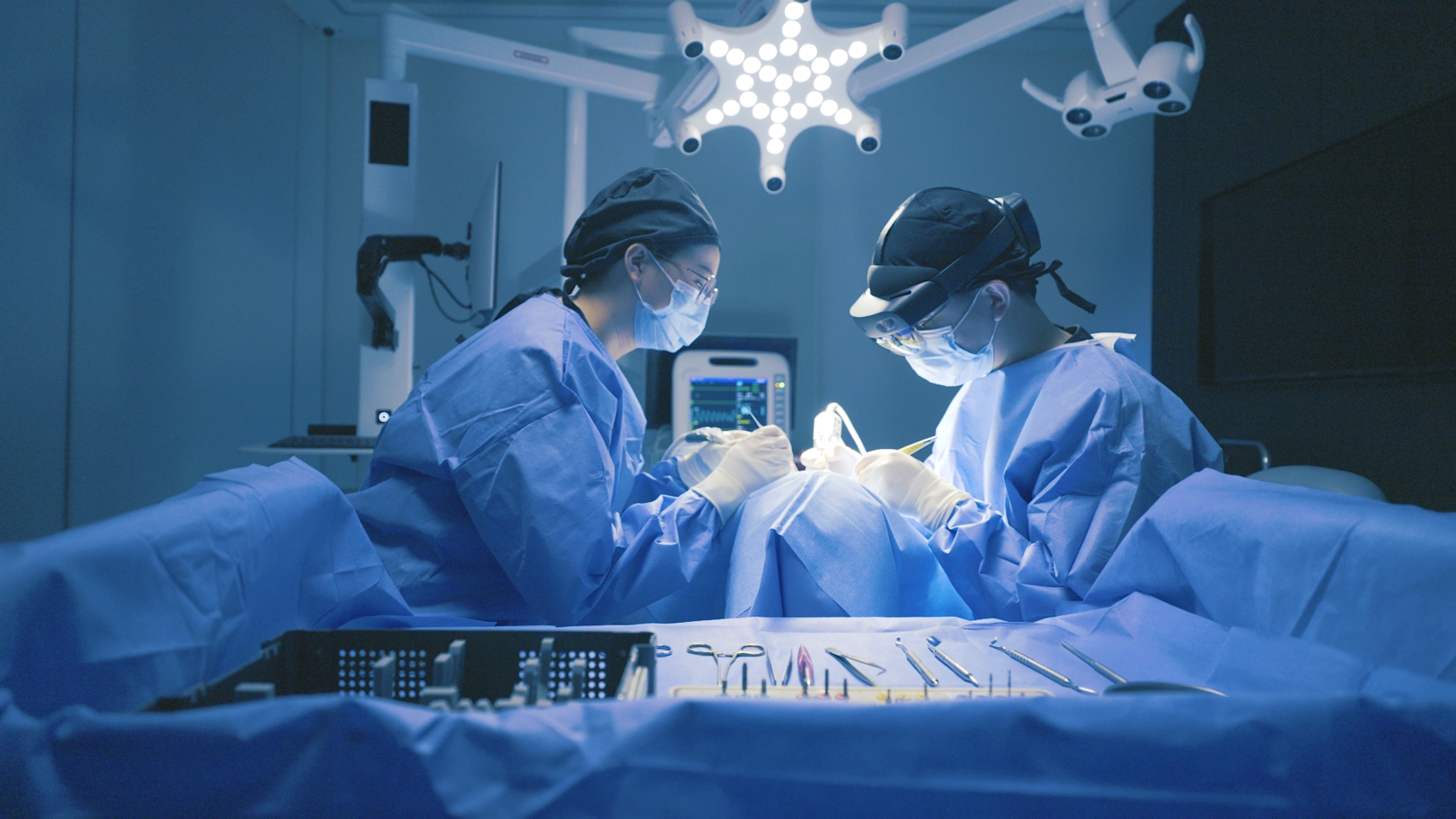 在方田医创口腔种植手术导航系统引导下,医生戴着AR眼镜进行手术。受访者供图