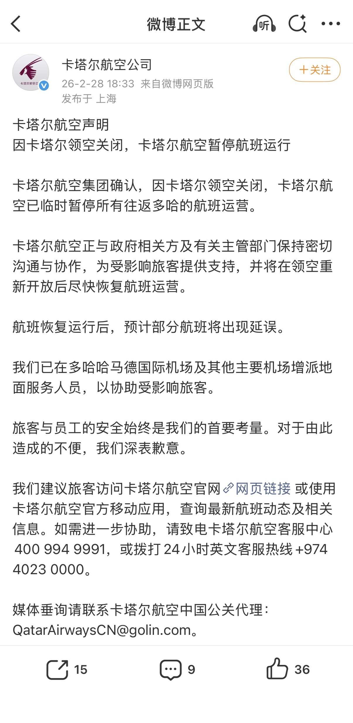 早在2月28日18:33,卡塔尔航空公司在微博发布声明,表示因卡塔尔领空关闭,卡塔尔航空暂停航班运行,并将在领空重新开放后尽快恢复航班运营。