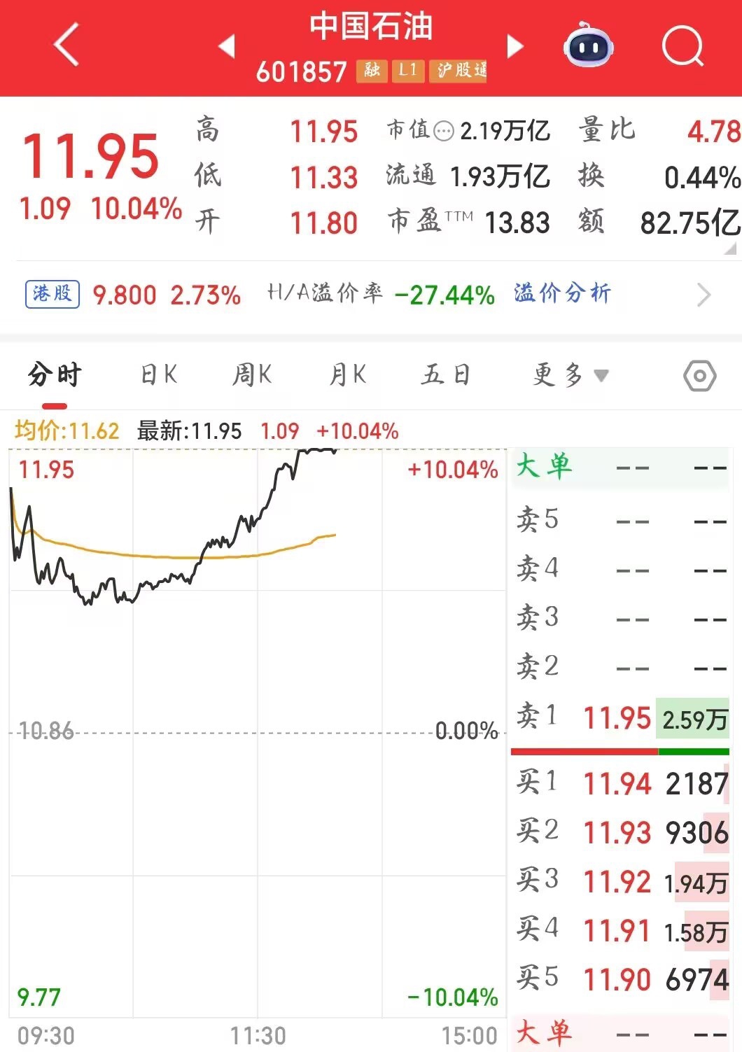 3月2日午后,A股油气板块持续走强,中国石油触及涨停,股价创下2015年4月以来新高。截至发稿,中国石油股价11.95元,涨幅10.04%。A股总市值达2.19万亿元。板块内掀涨停潮,中国海油、科力股份、通源石油等近20股涨停,首华燃气、凯添燃气涨超10%,能源主线全线走高。