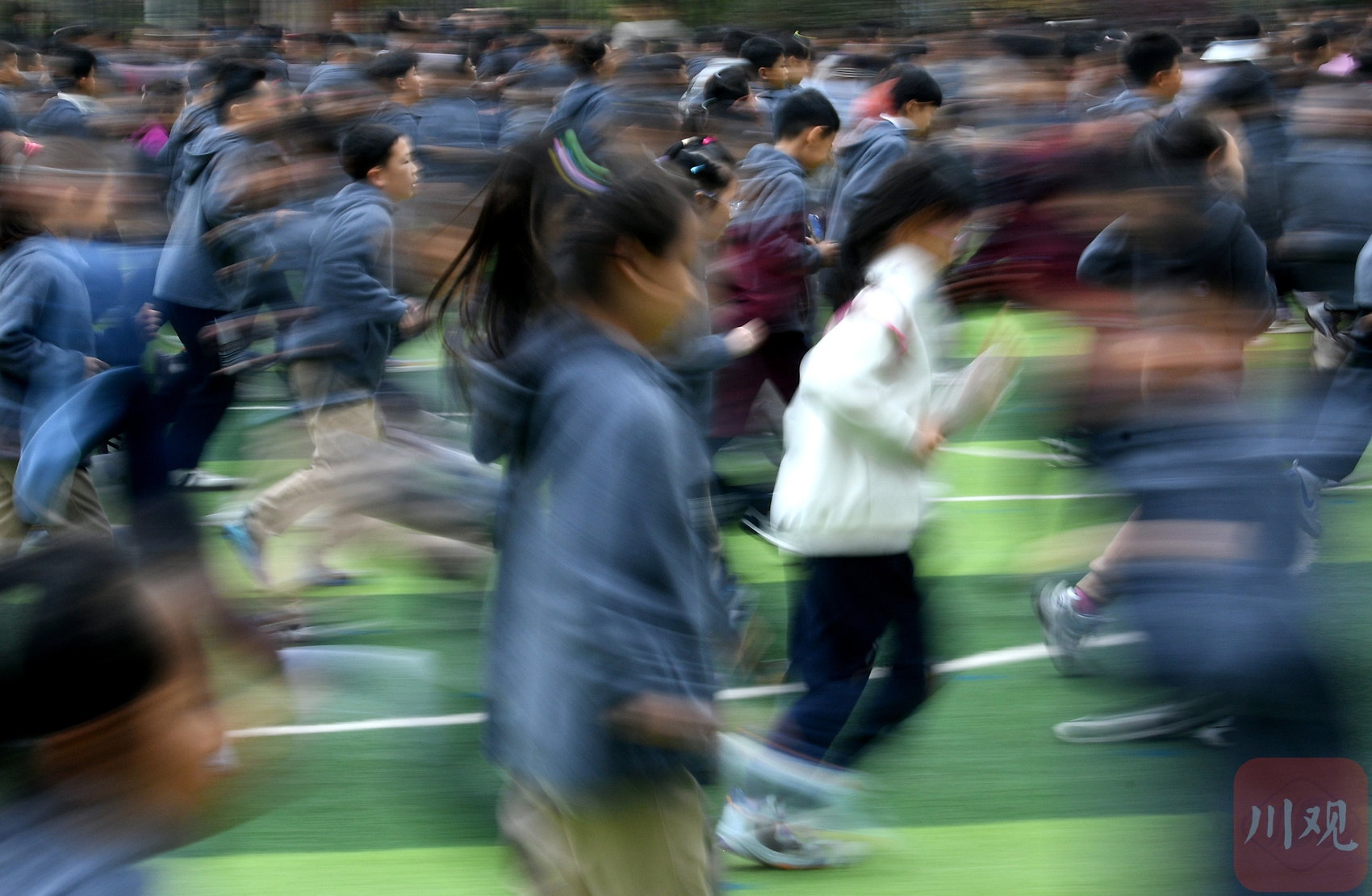 学生们在大课间跑步。